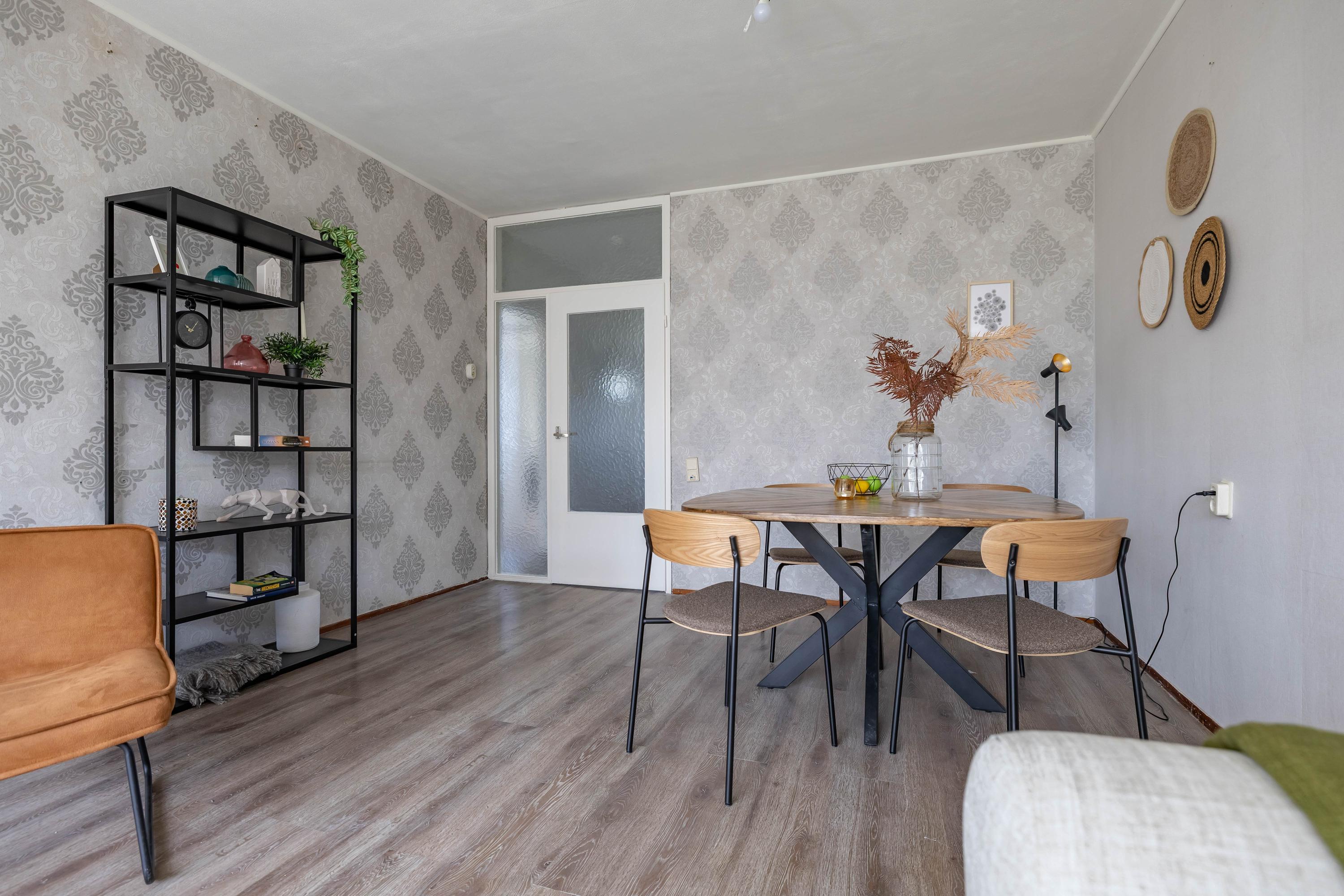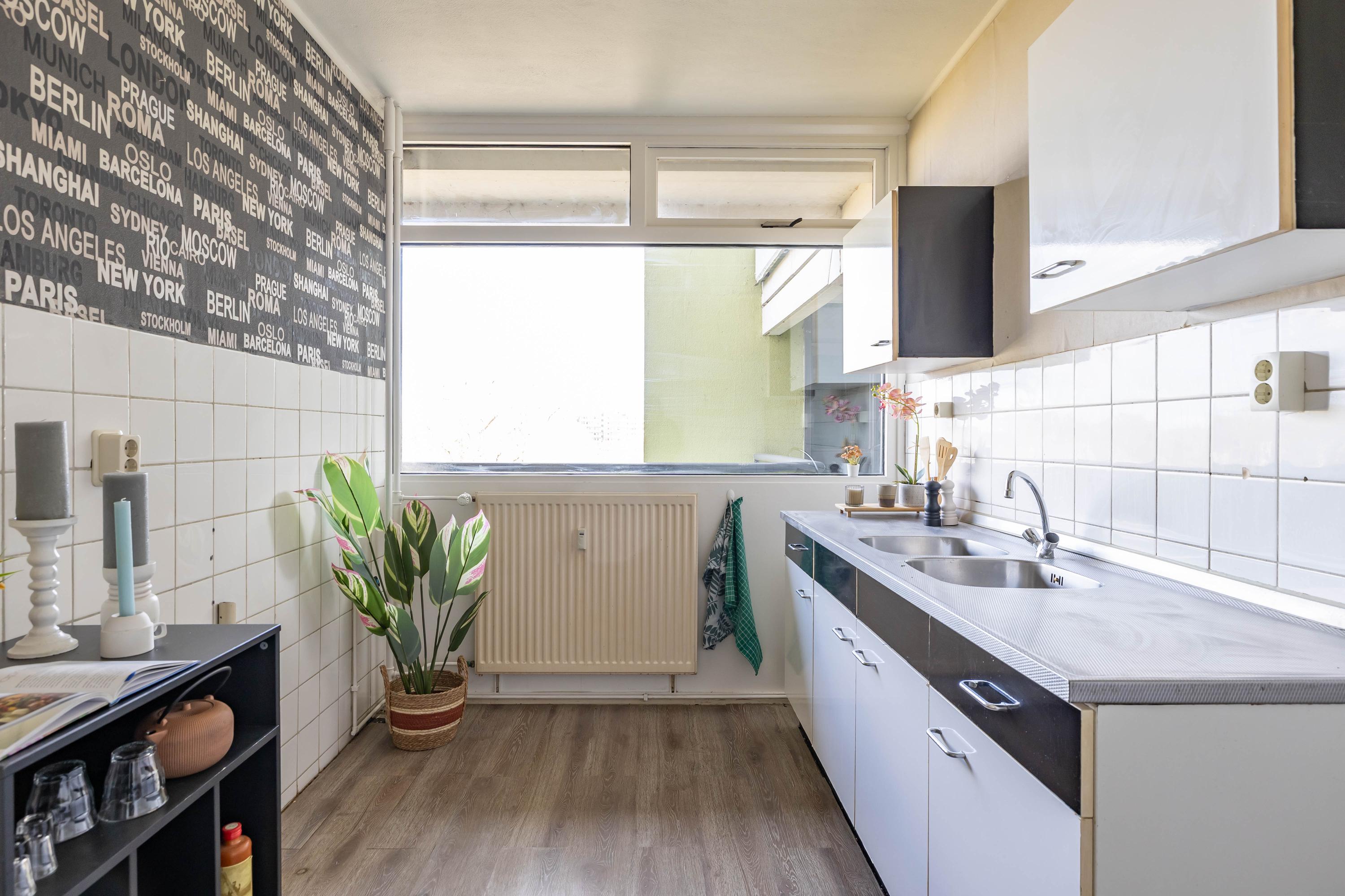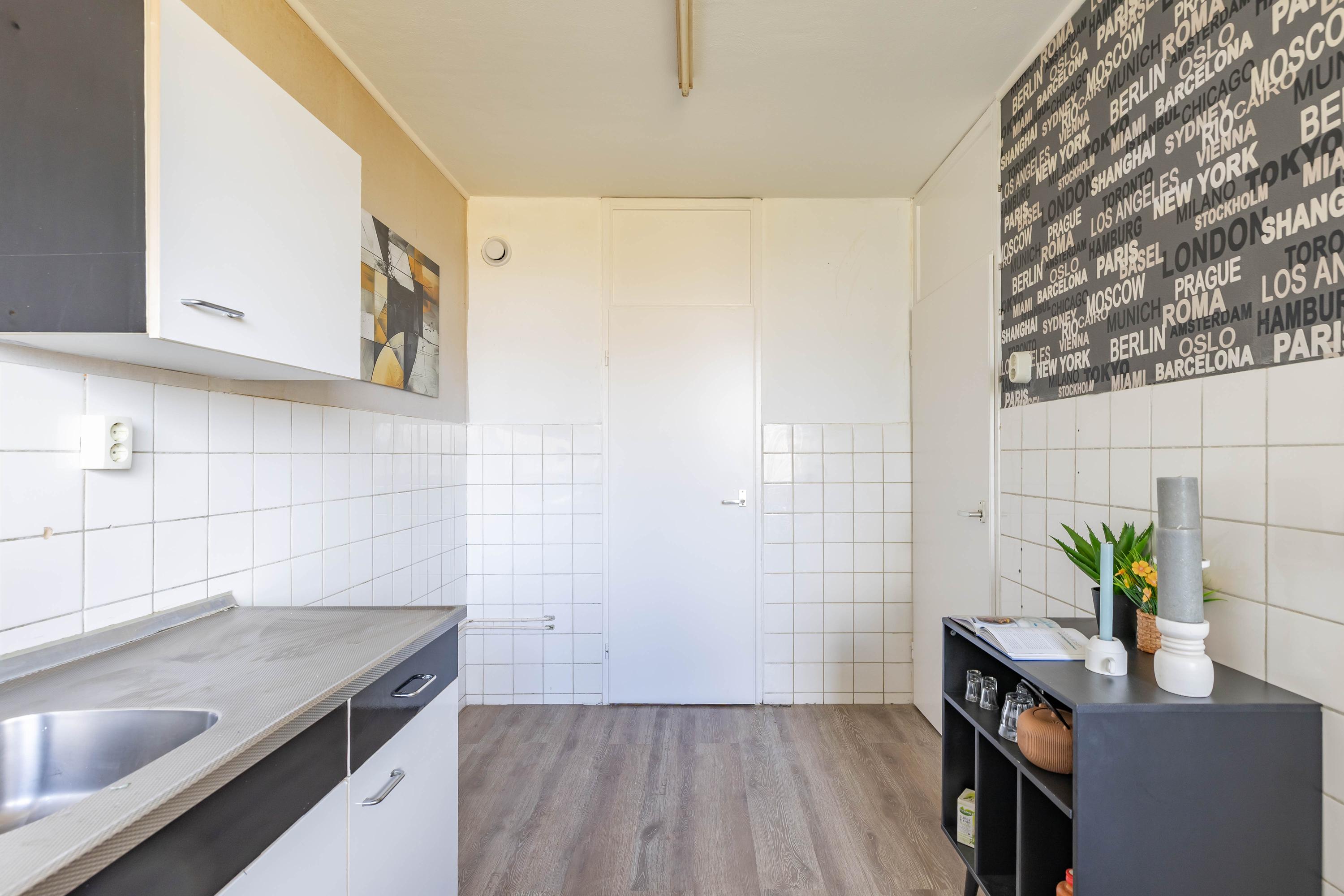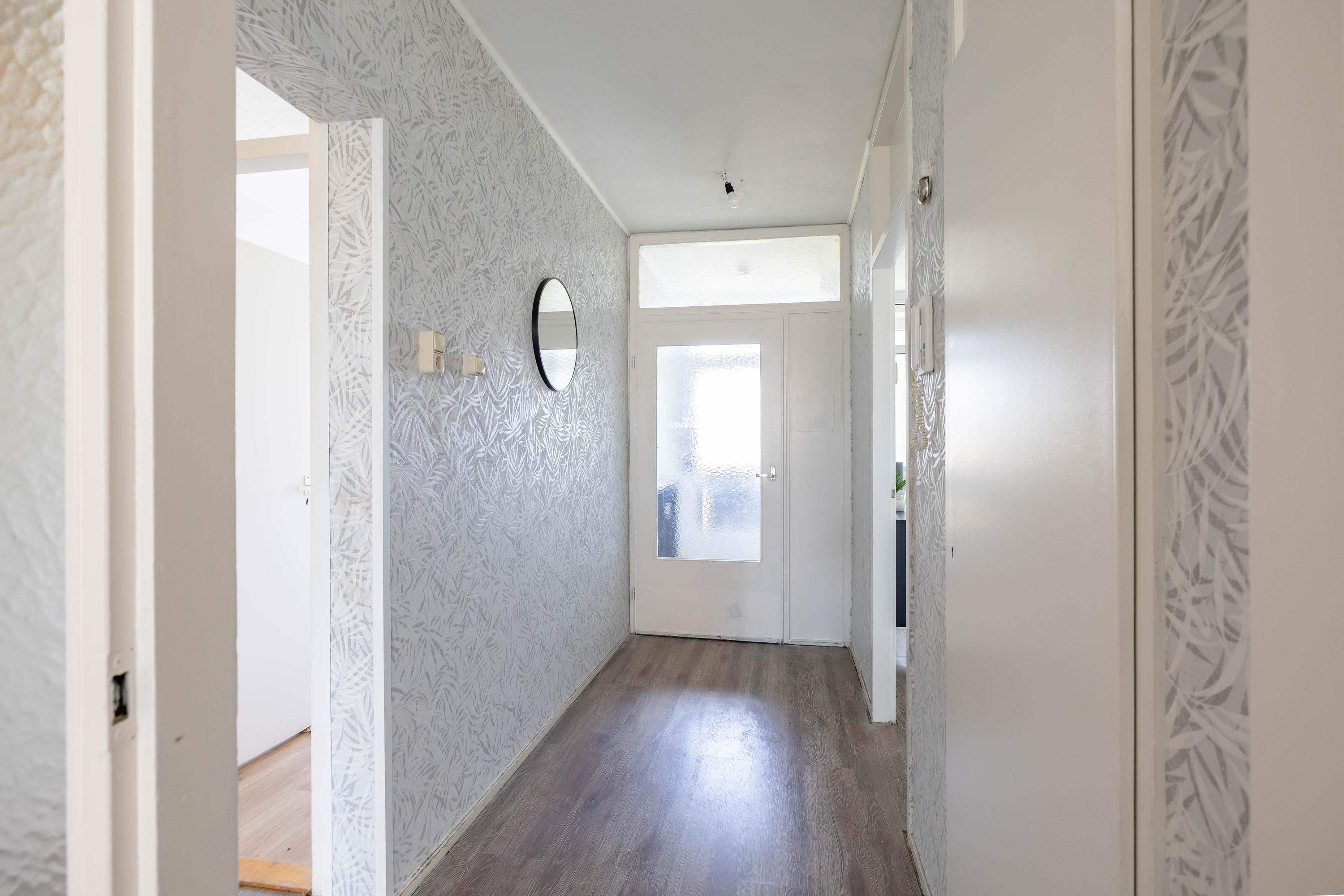 Bij binnenkomst tref je de hal die toegang geeft tot de verschillende ruimtes. De woonkamer vormt het centrale punt van de woning en biedt een prettige lichtinval. Vanuit de hal is ook de separate, ruime keuken te bereiken. Deze is eenvoudig uitgevoerd, maar biedt volop mogelijkheden om naar eigen wens te moderniseren en in te richten.