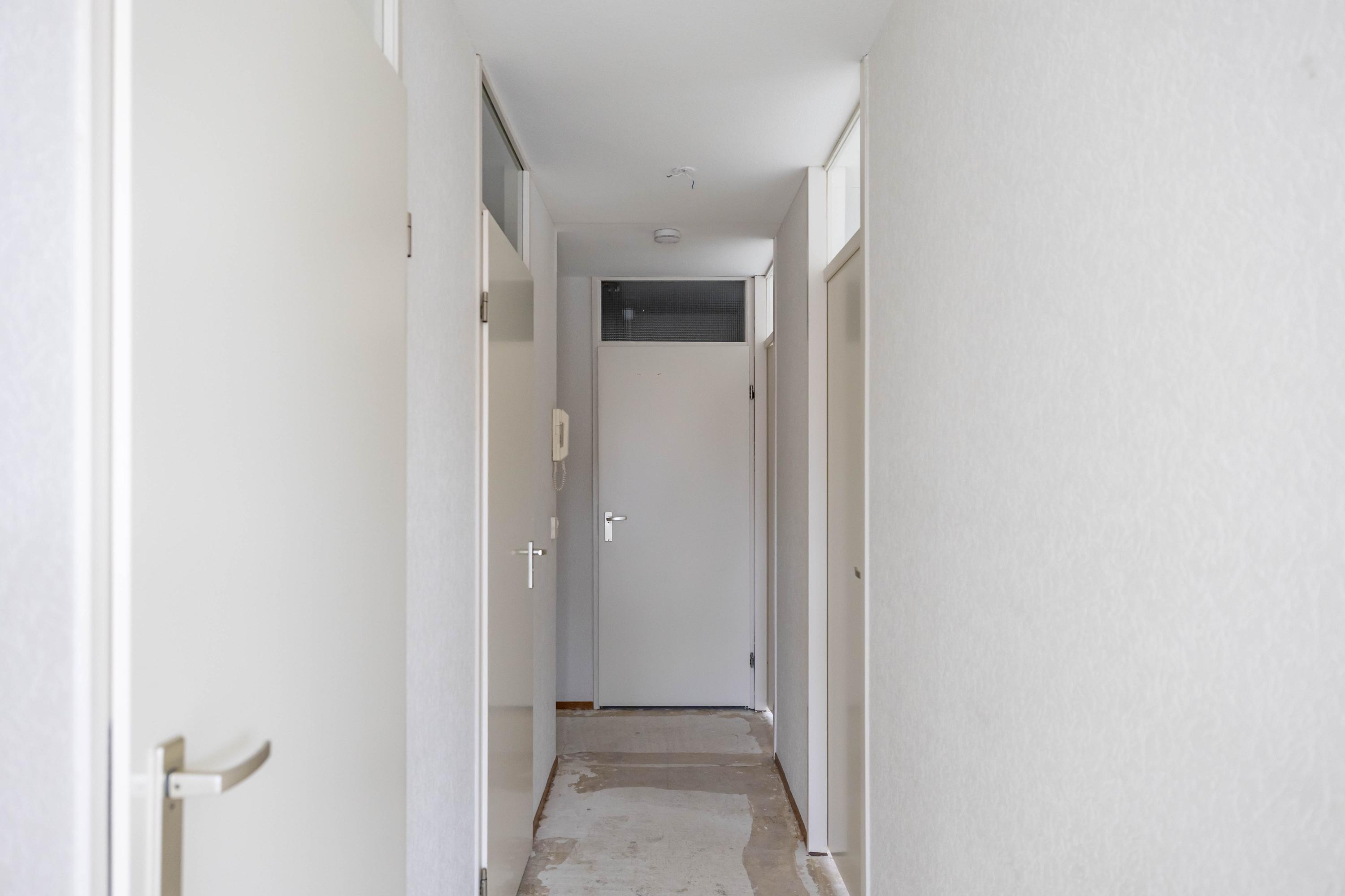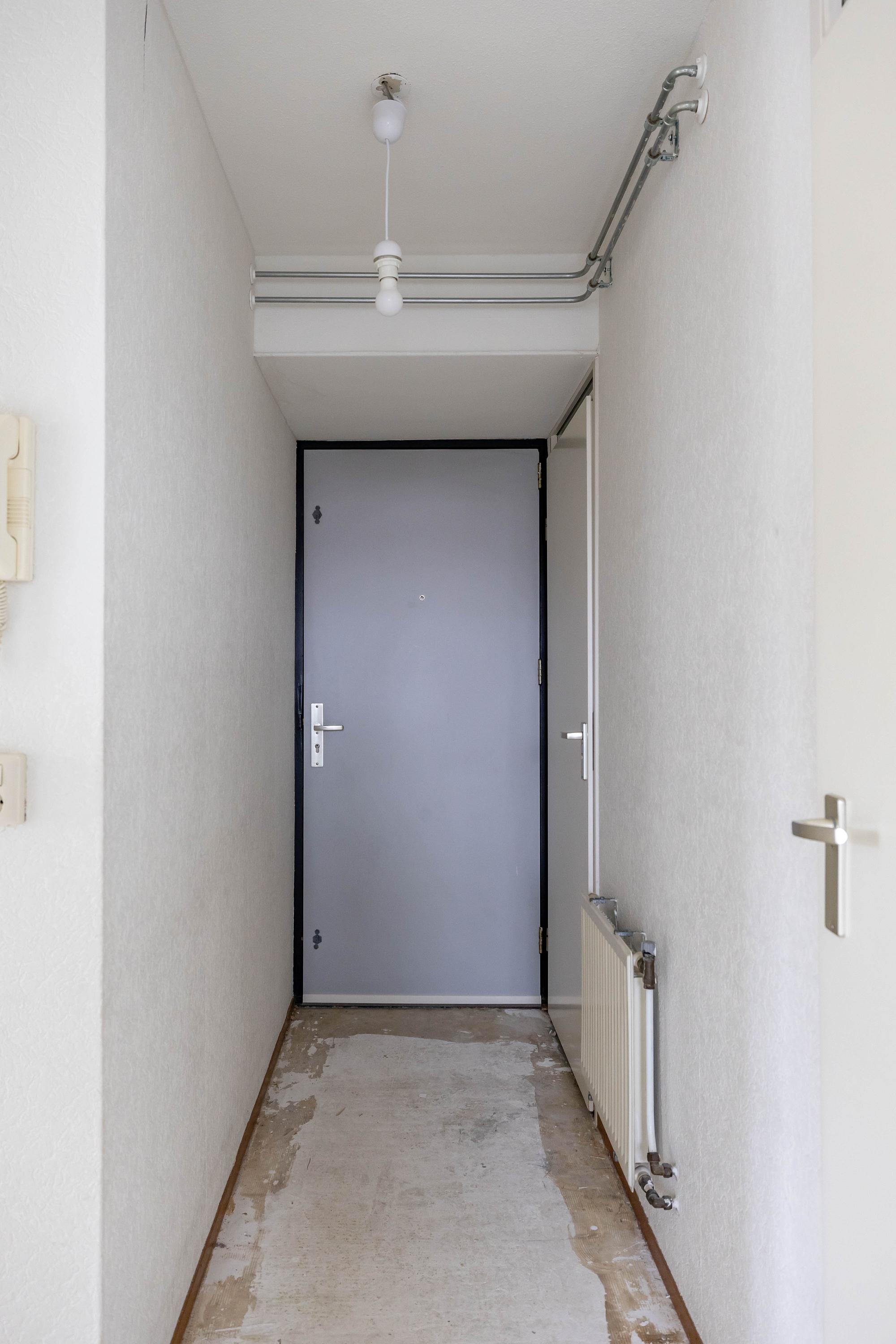 Indeling: entree, lift naar tweede woonlaag, entree appartement, gang met toilet, badkamer, twee slaapkamers, woonkamer met half open keuken, toegang tot balkon. Op de begane grond is een fietsenberging.
