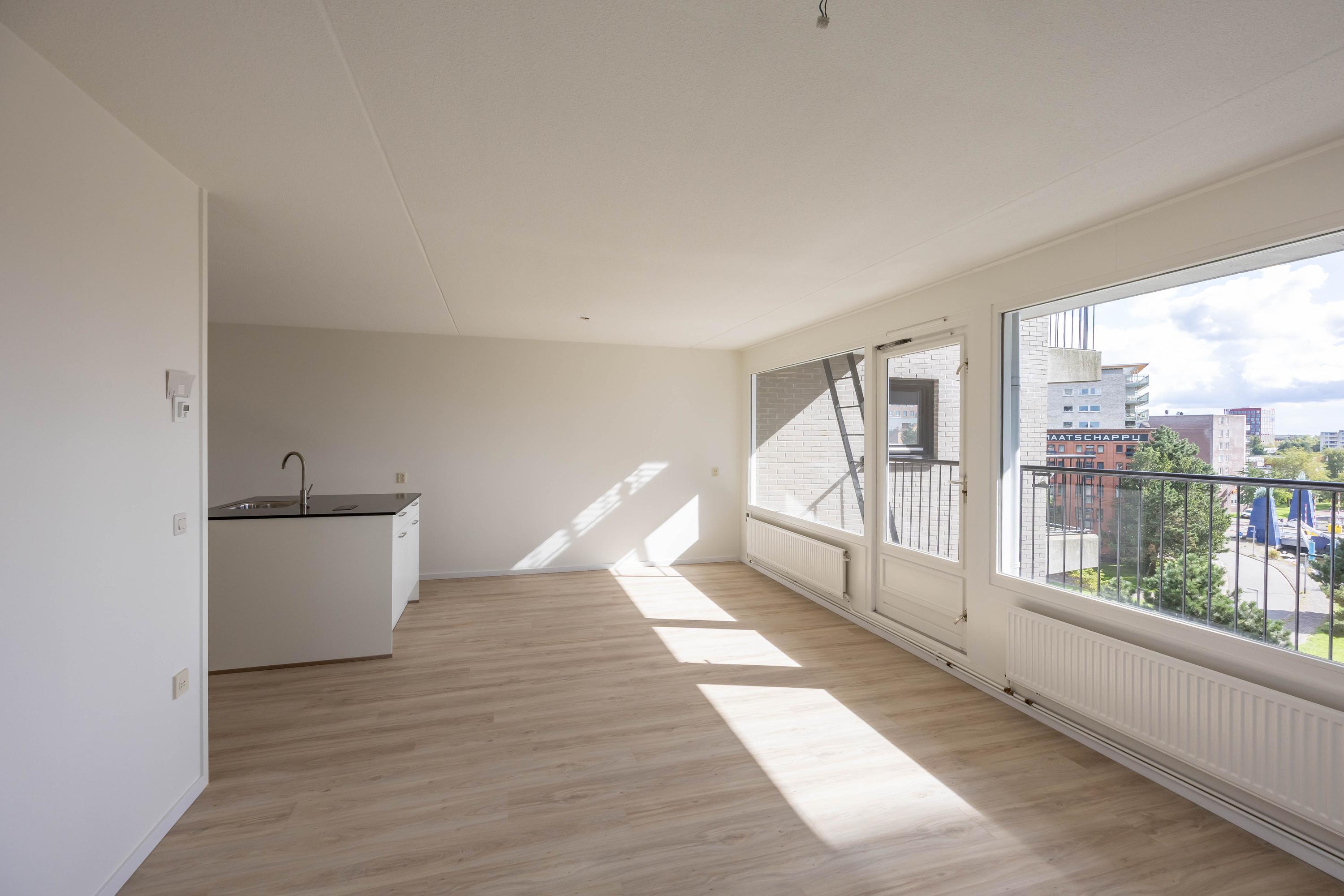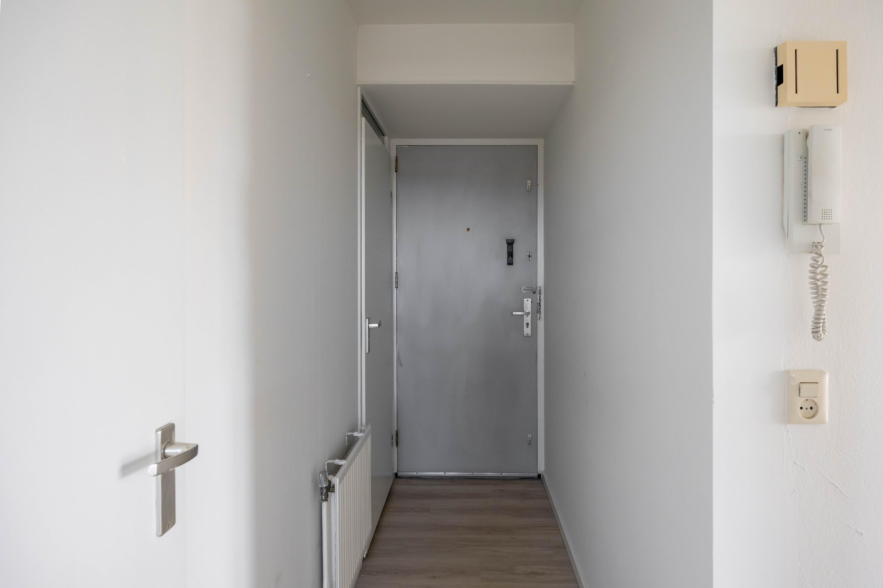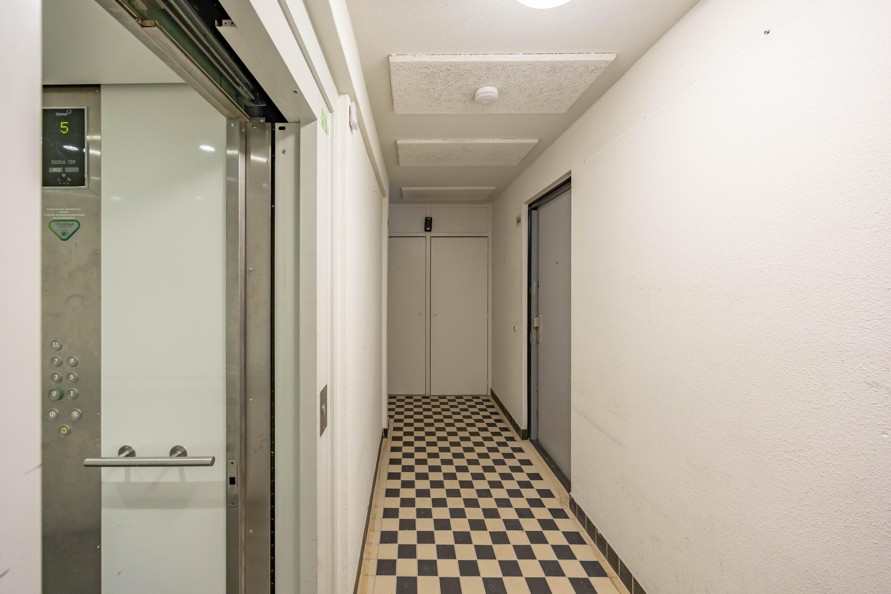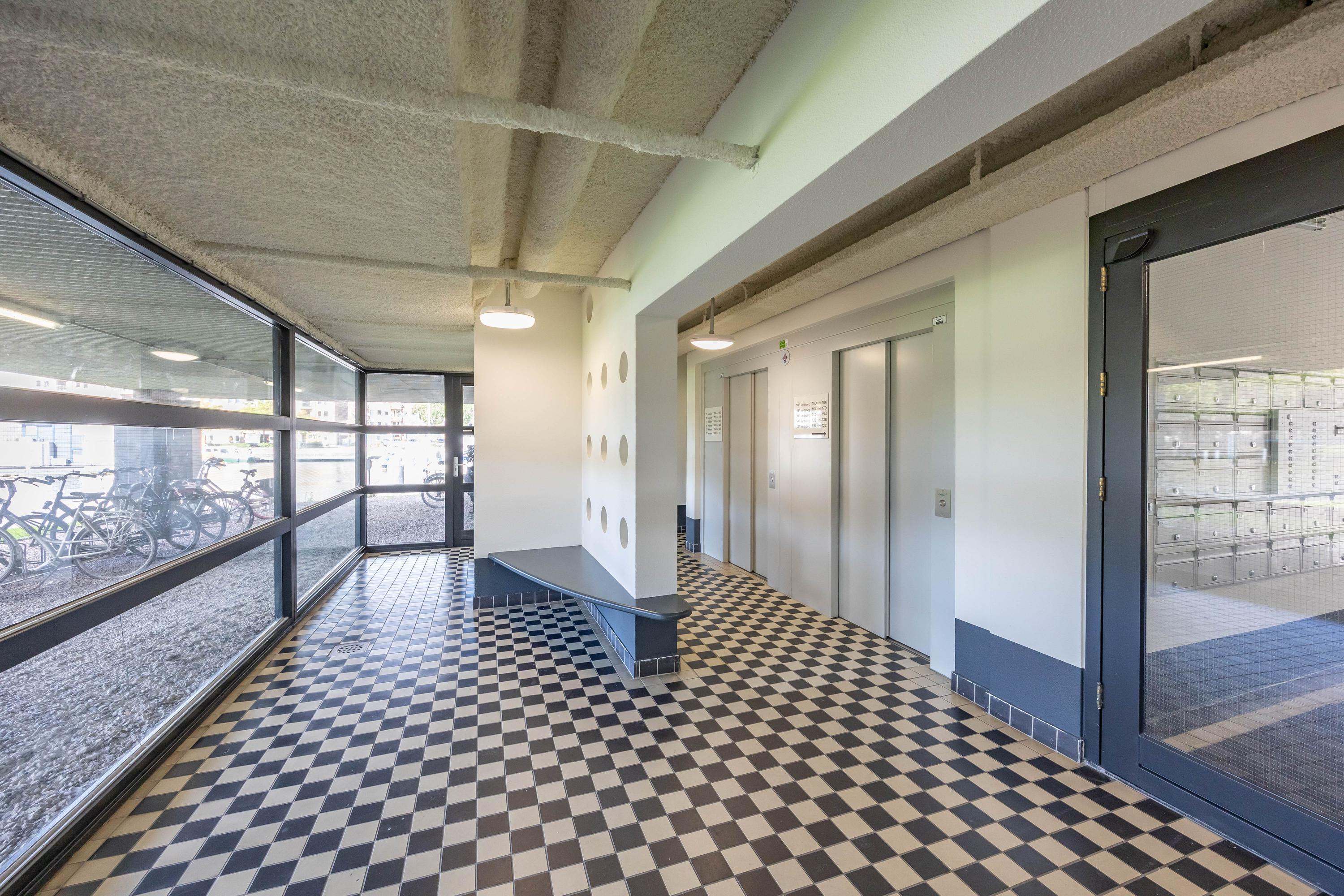Indeling: entree, lift naar vijfde woonlaag, entree appartement, gang met toilet, badkamer, twee slaapkamers, woonkamer met open keuken, toegang tot balkon. Op de begane grond is een fietsenberging.