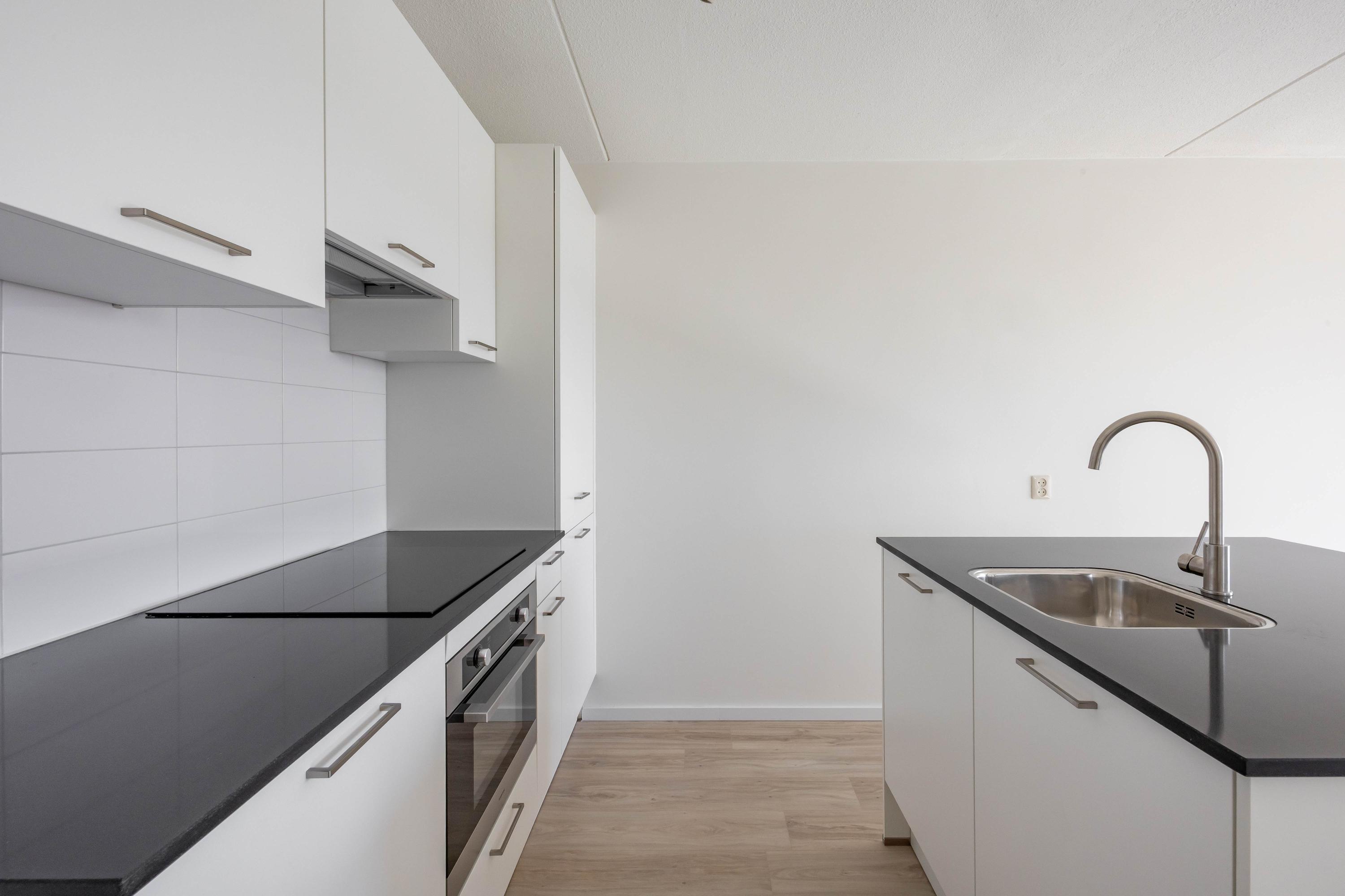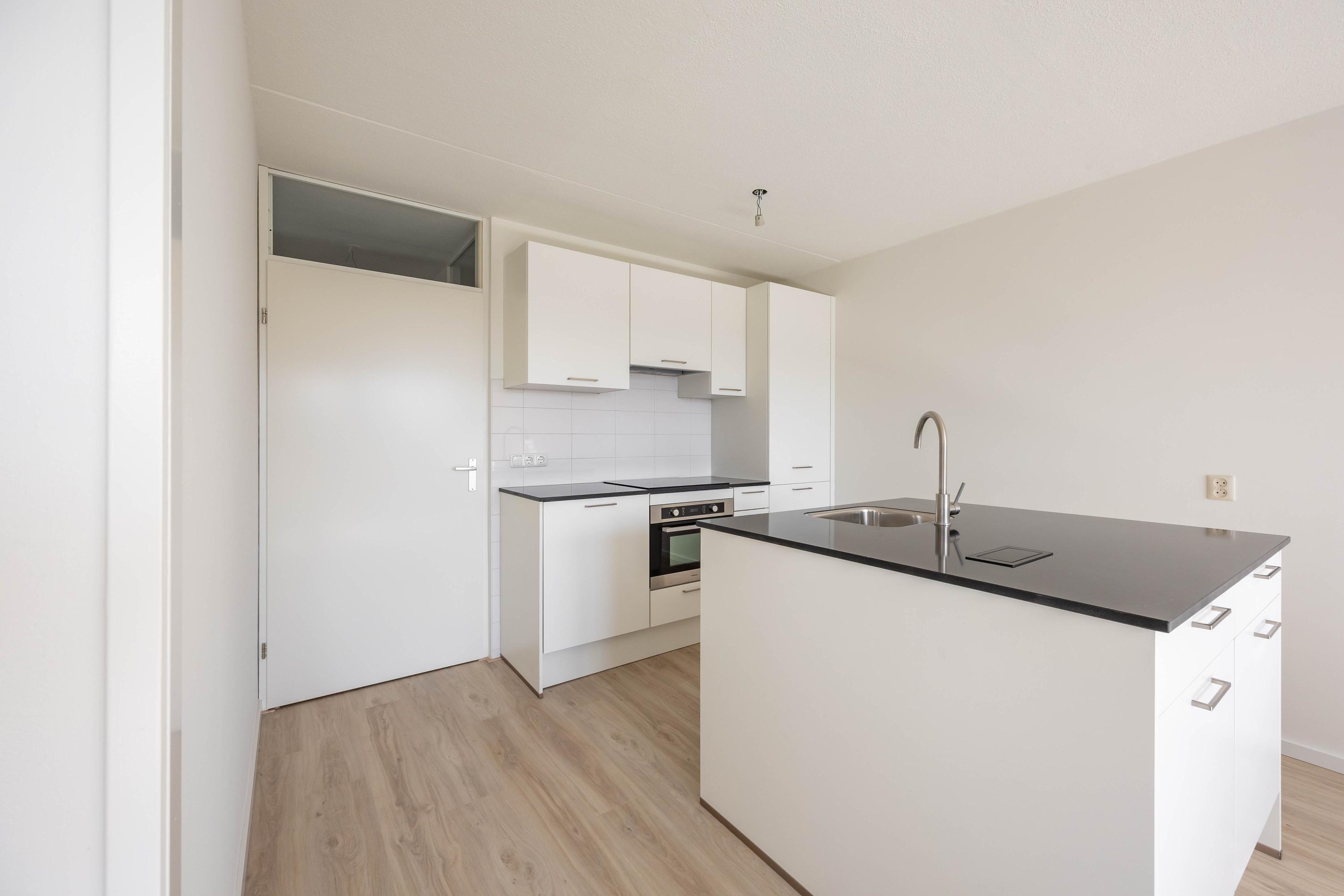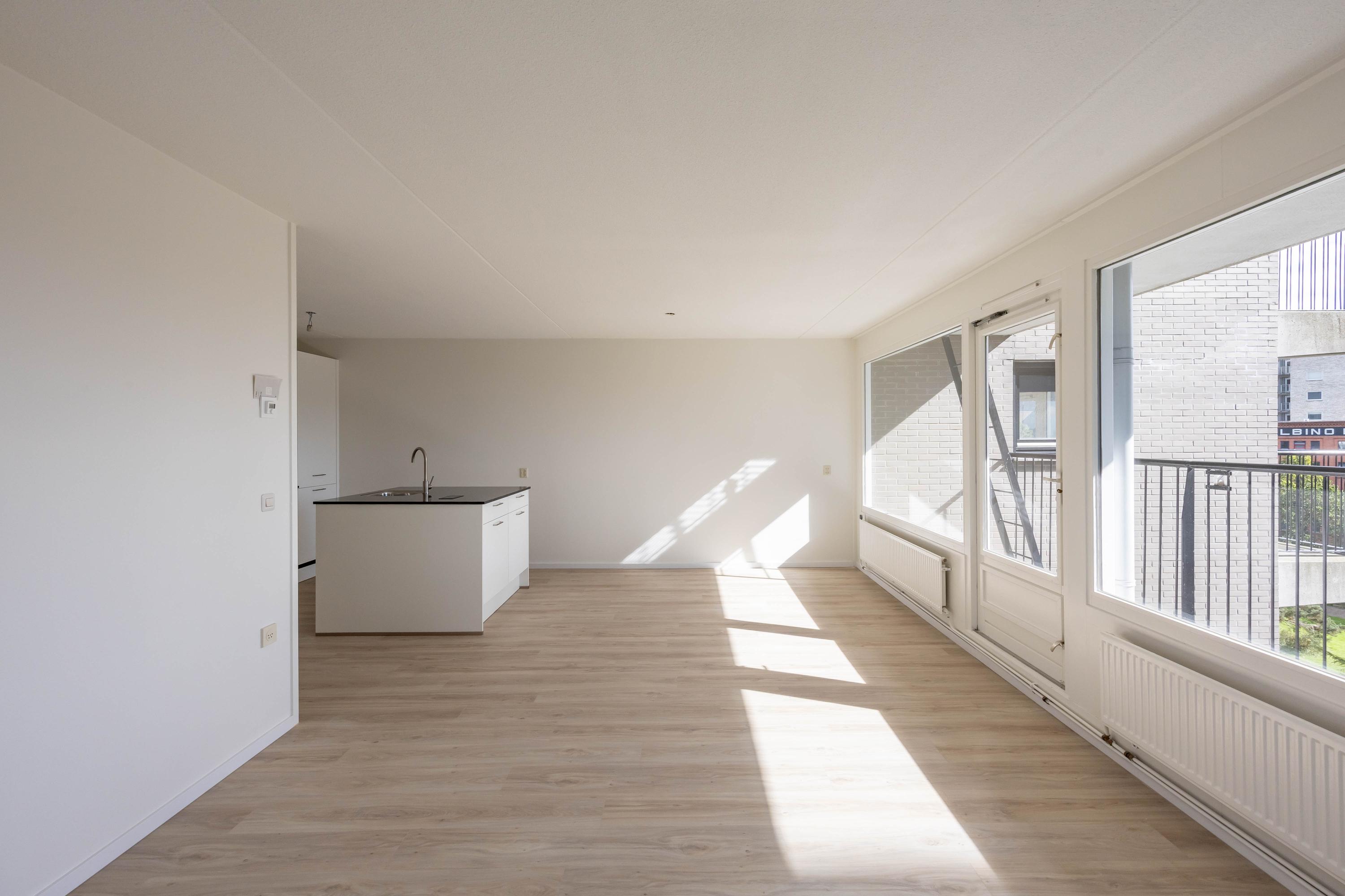 Indeling: entree, lift naar vijfde woonlaag, entree appartement, gang met toilet, badkamer, twee slaapkamers, woonkamer met open keuken, toegang tot balkon. Op de begane grond is een fietsenberging.