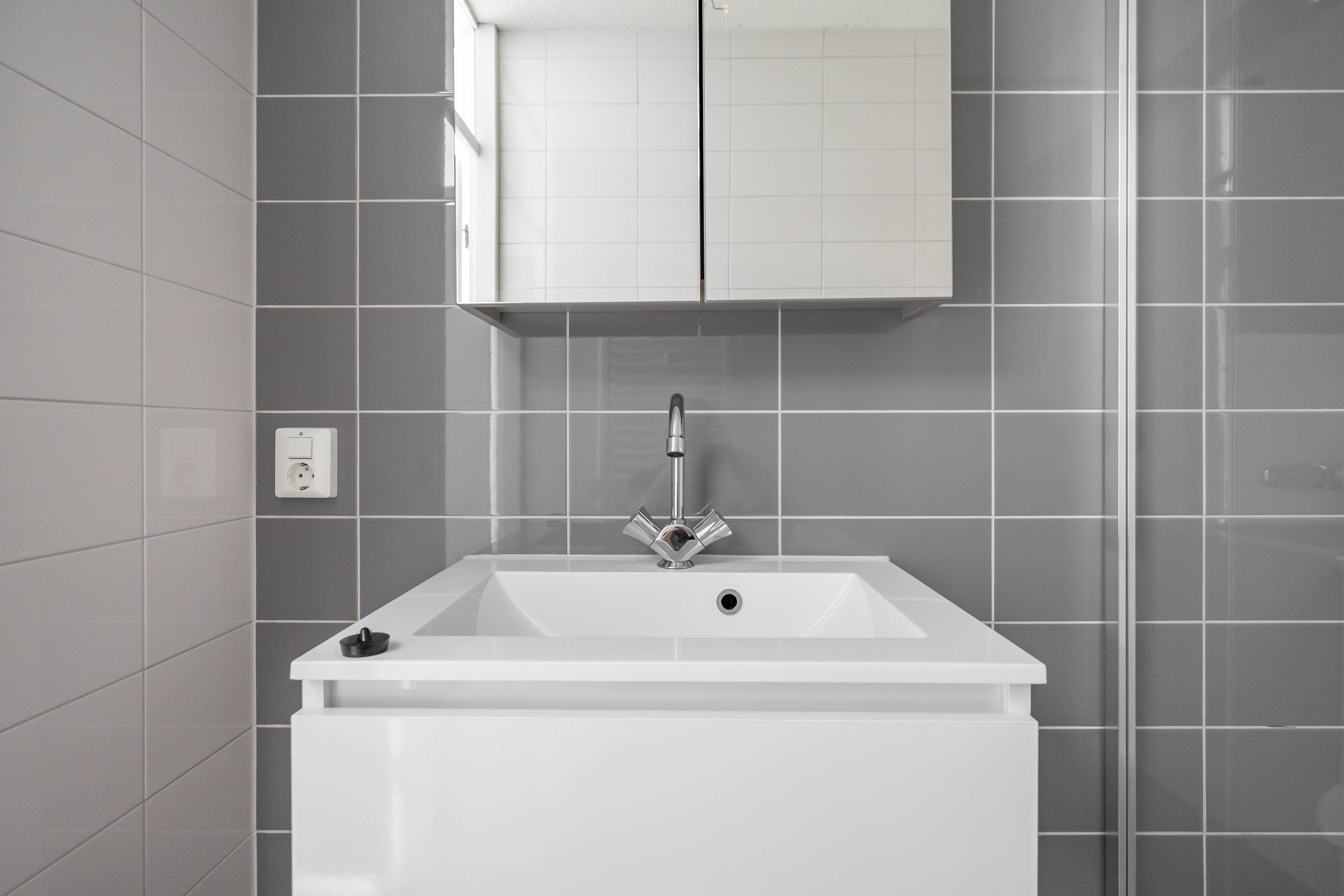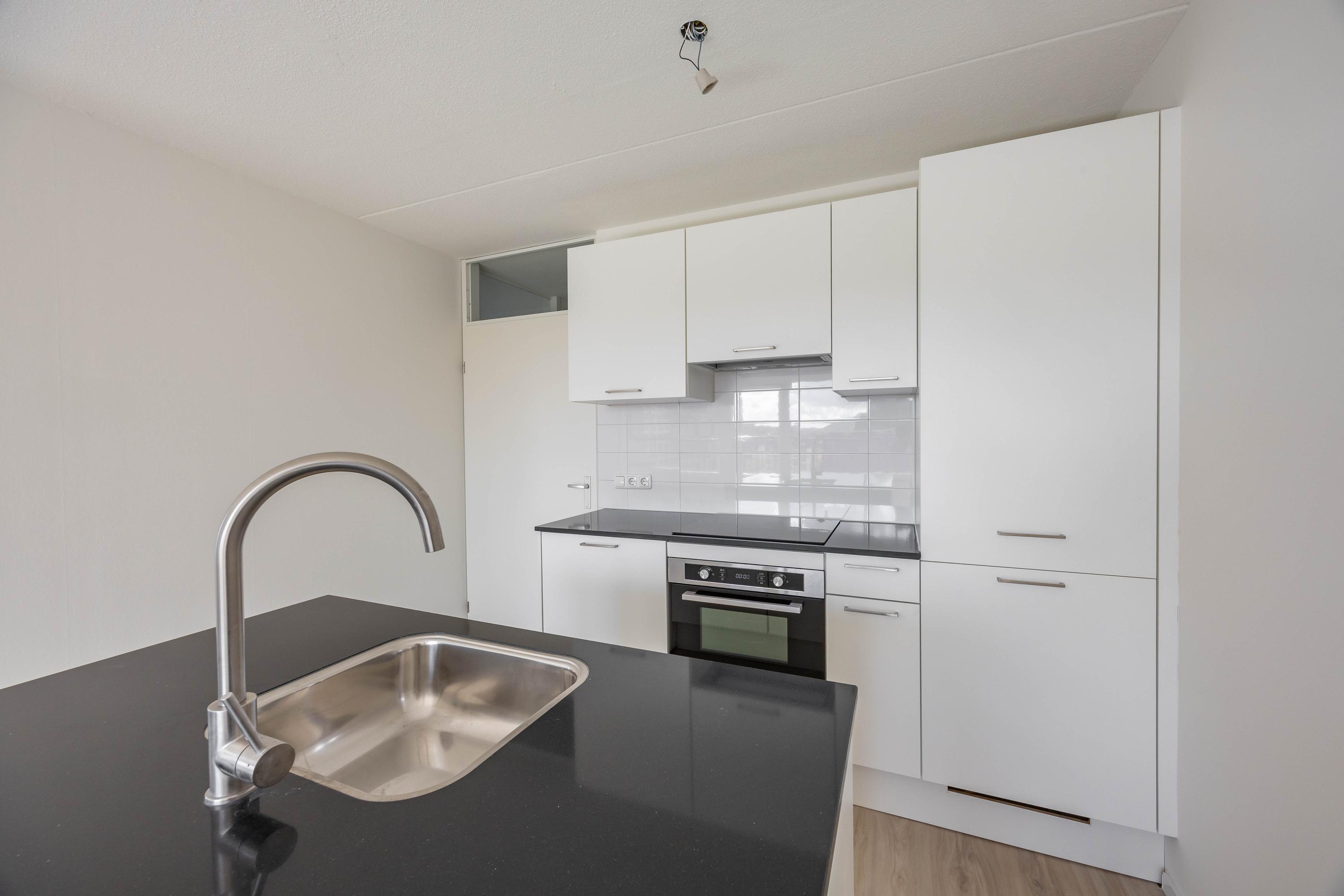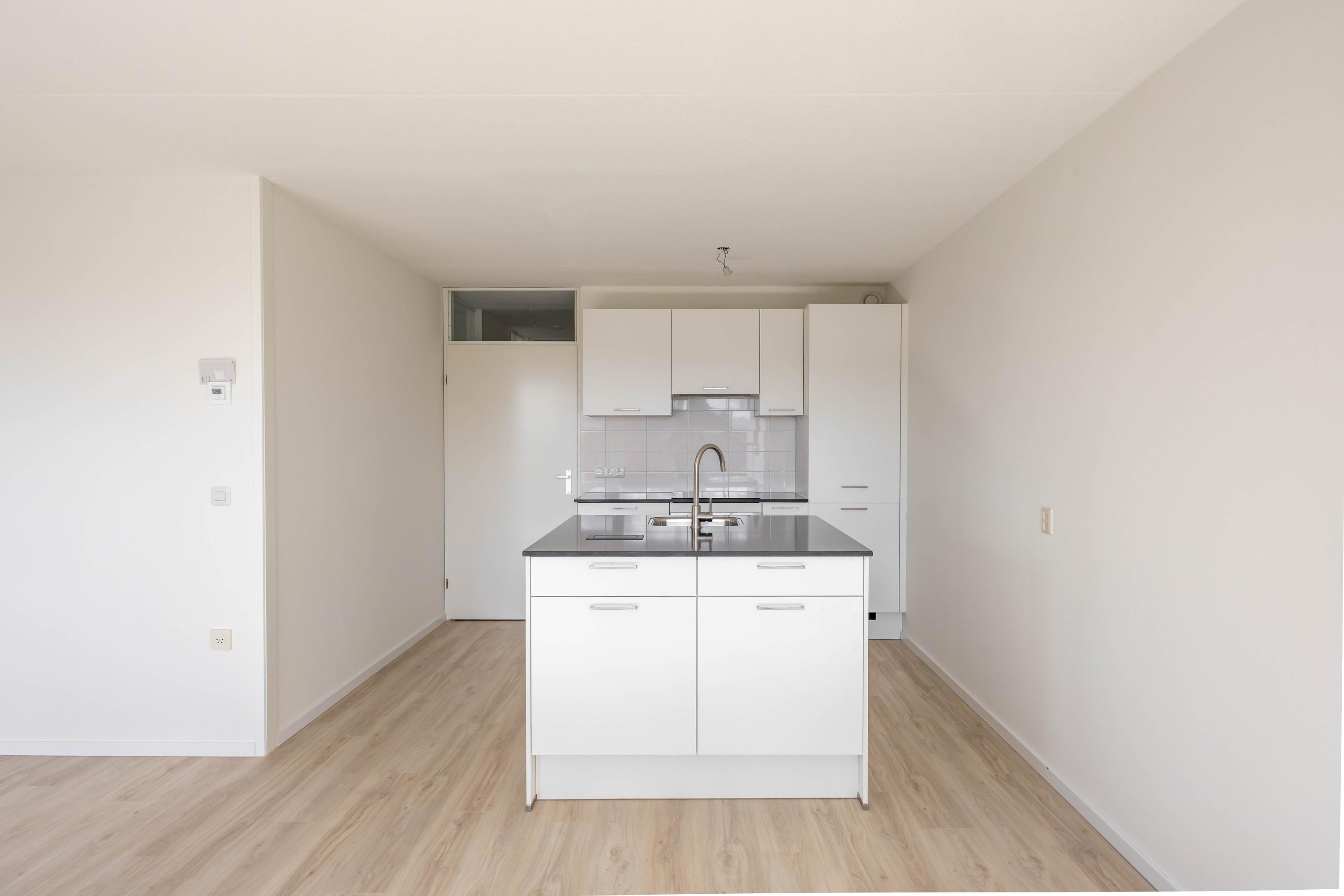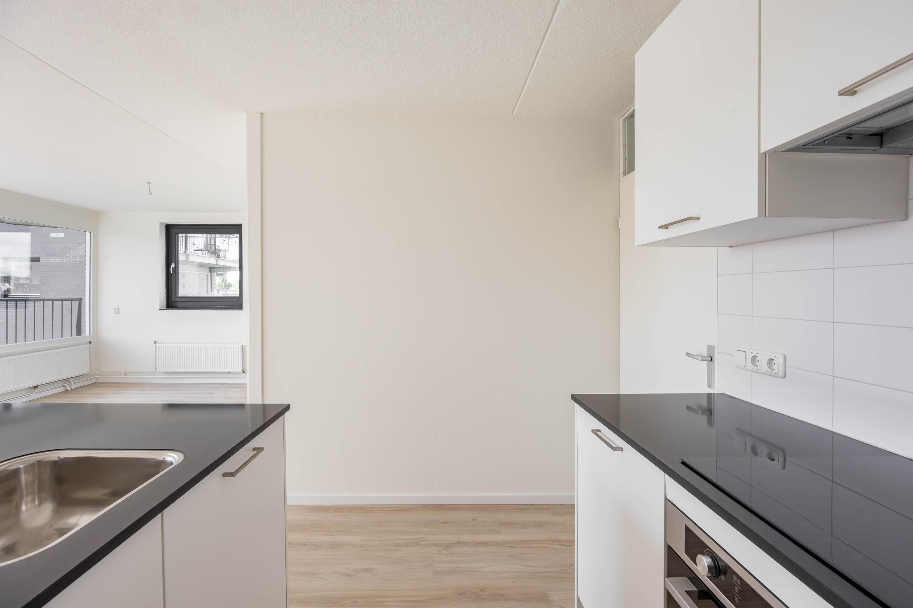 Indeling: entree, lift naar vijfde woonlaag, entree appartement, gang met toilet, badkamer, twee slaapkamers, woonkamer met open keuken, toegang tot balkon. Op de begane grond is een fietsenberging.