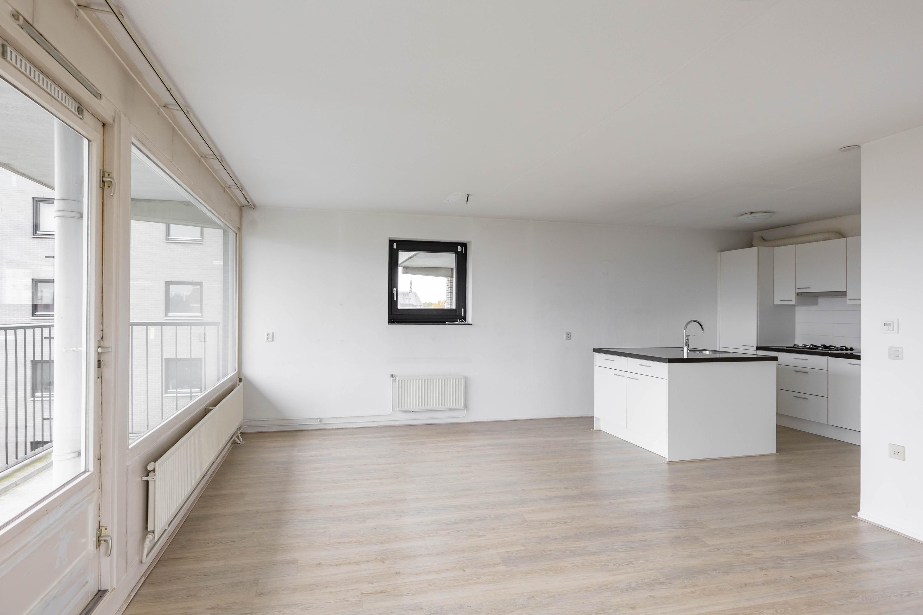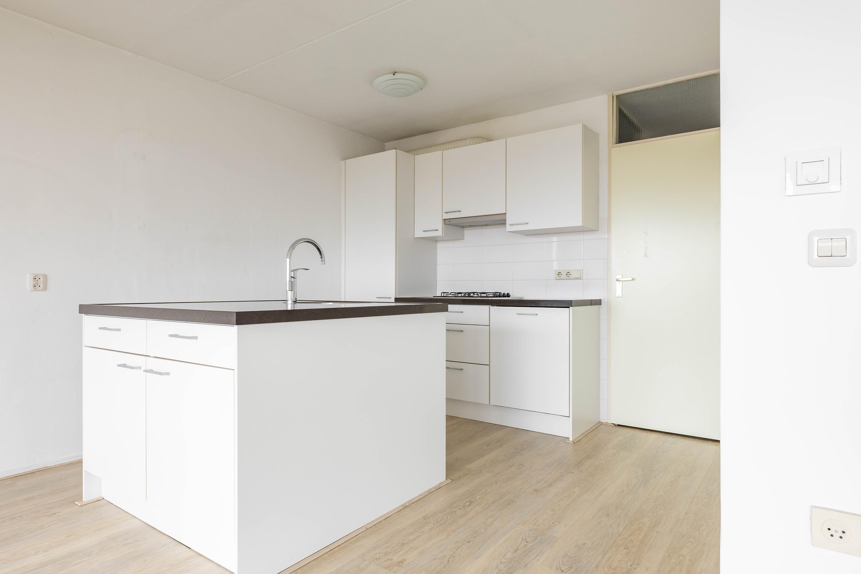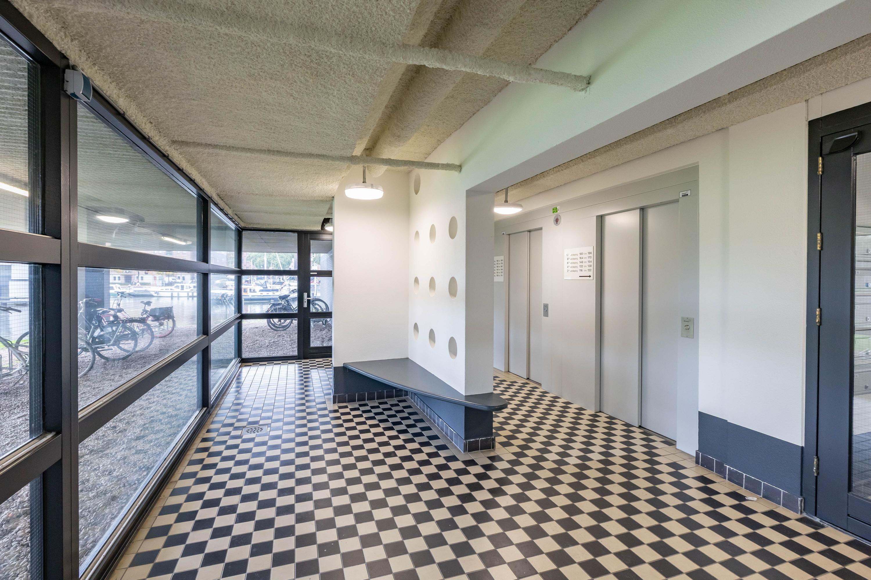 Indeling: entree, lift naar vijfde woonlaag, entree appartement, gang met toilet, badkamer, twee slaapkamers woonkamer met open keuken, toegang tot balkon. Op de begane grond is een fietsenberging.