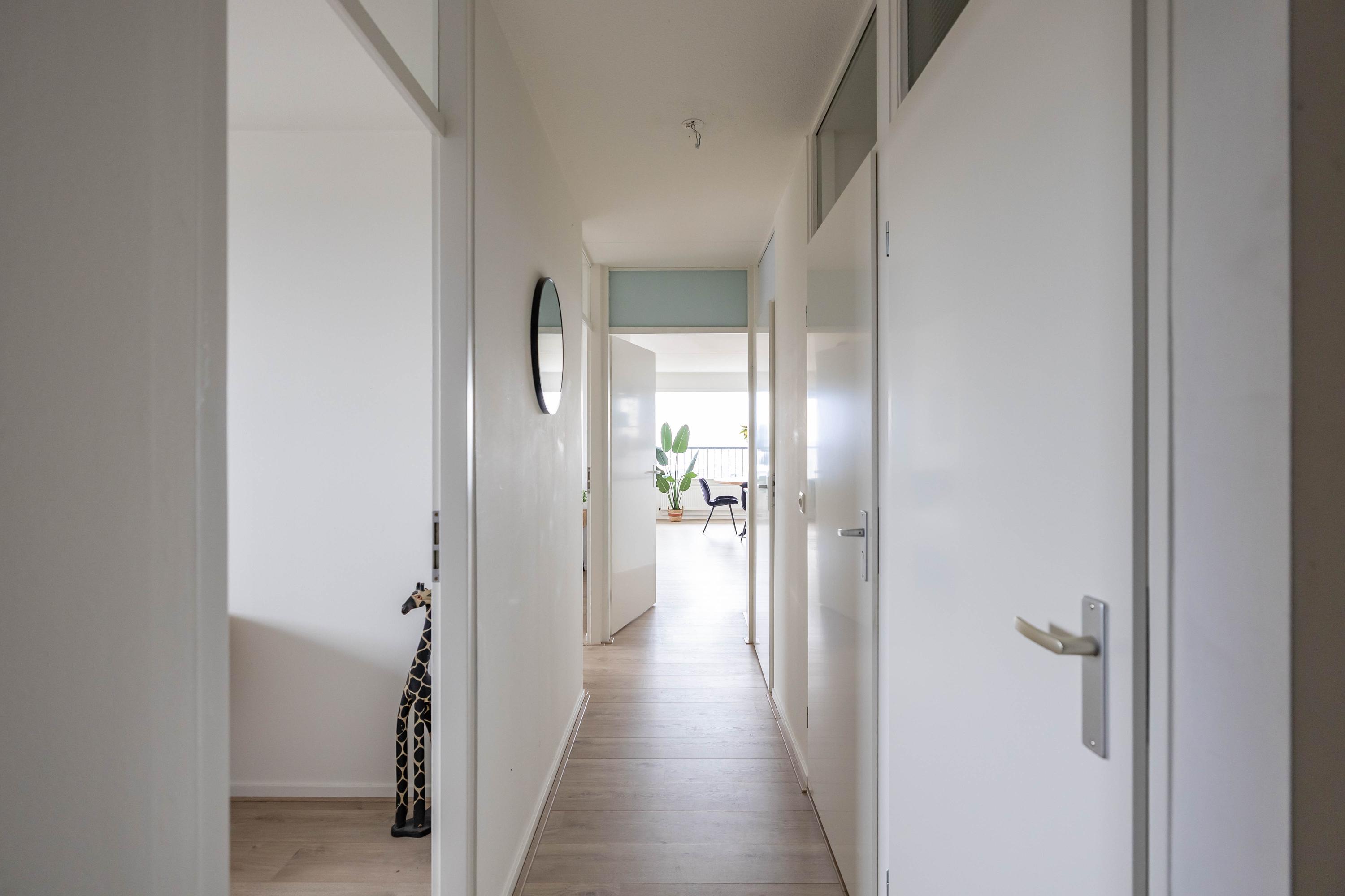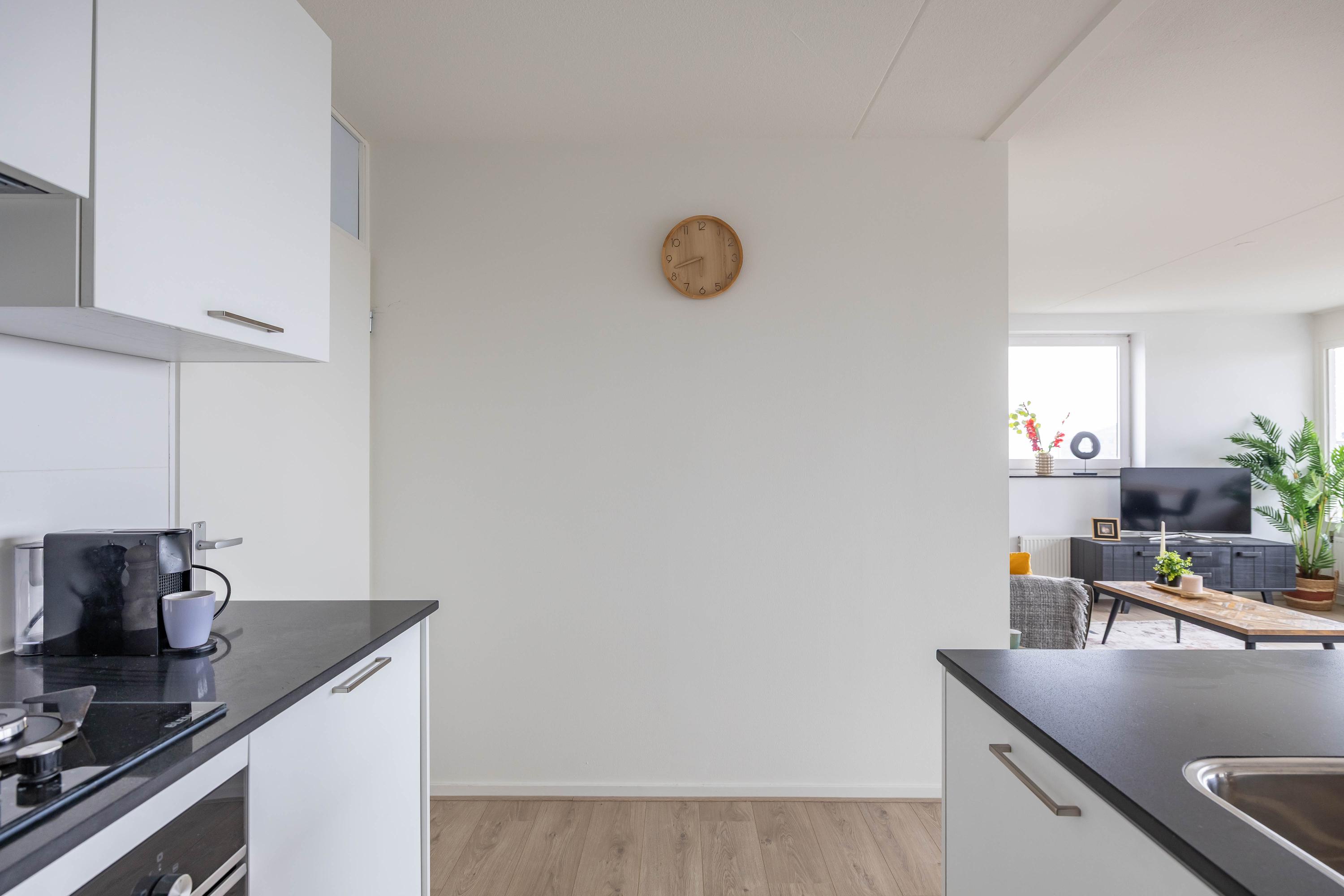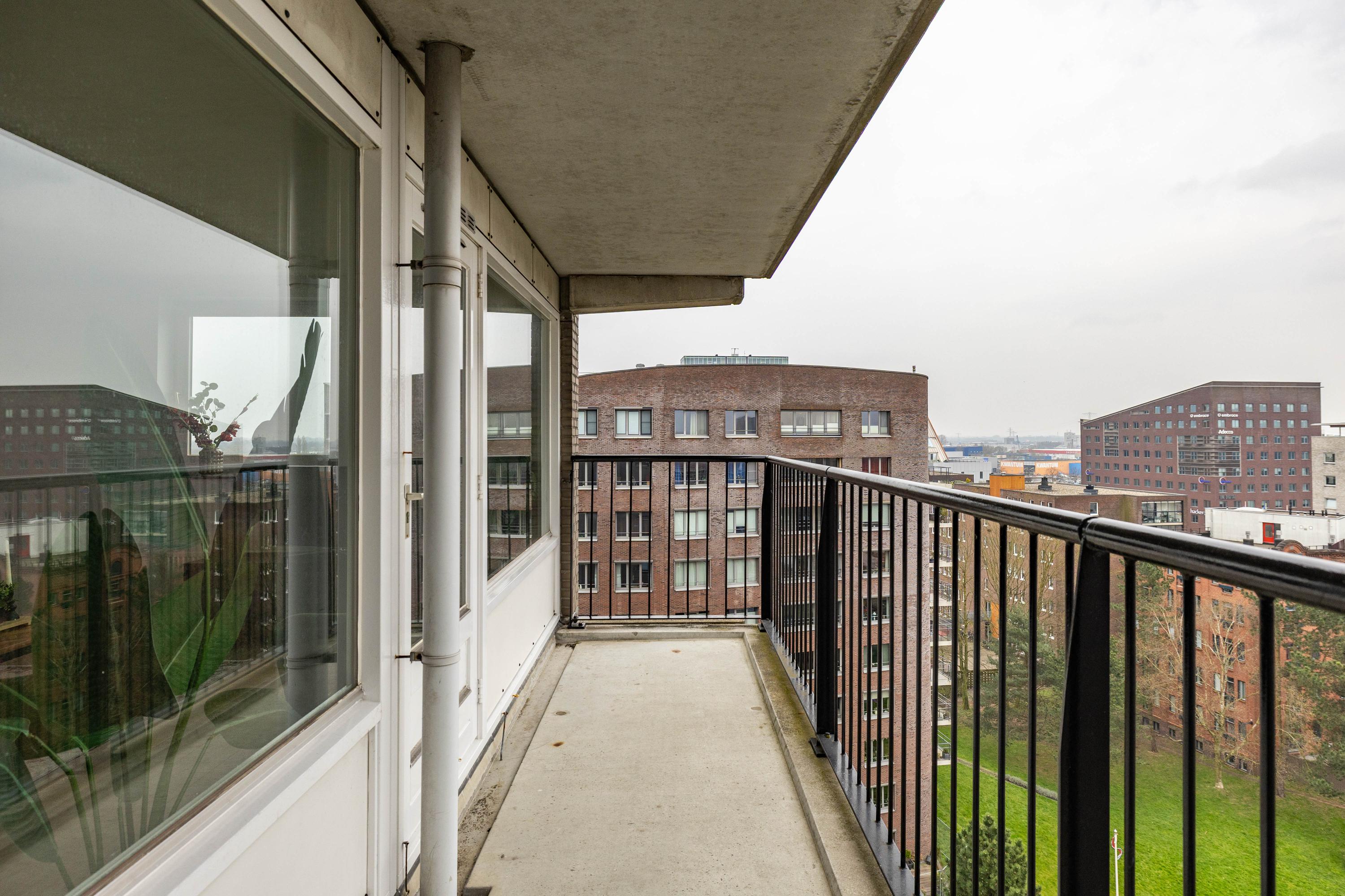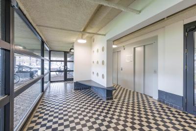 Indeling: entree, lift naar negende woonlaag, entree appartement, gang met toilet, badkamer, twee slaapkamers woonkamer met open keuken, toegang tot balkon. Op de begane grond is een fietsenberging.