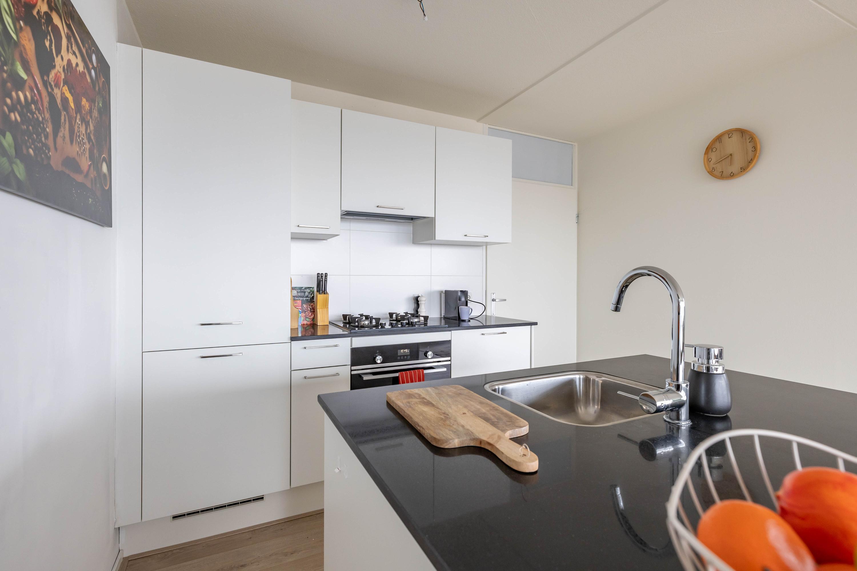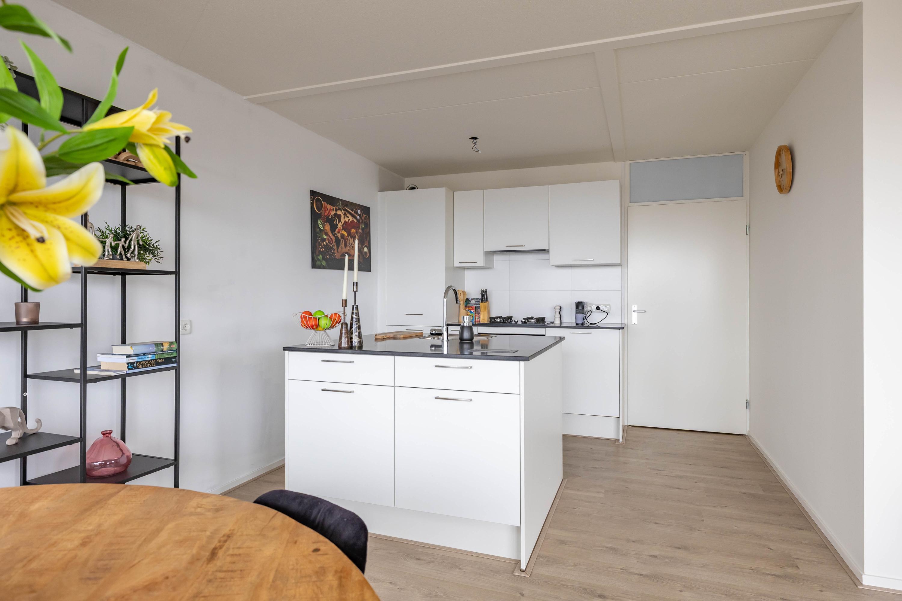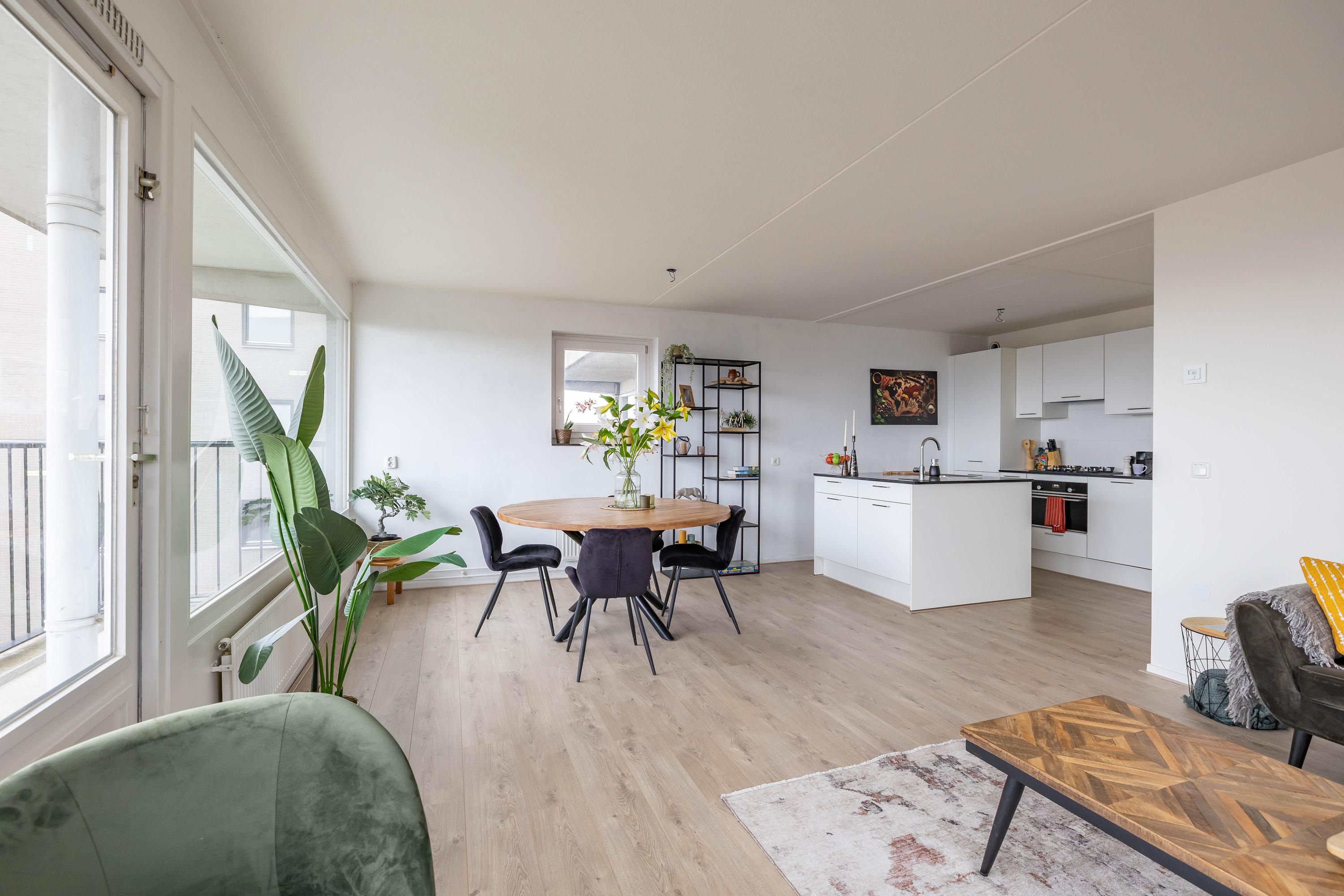 Indeling: entree, lift naar negende woonlaag, entree appartement, gang met toilet, badkamer, twee slaapkamers woonkamer met open keuken, toegang tot balkon. Op de begane grond is een fietsenberging.
