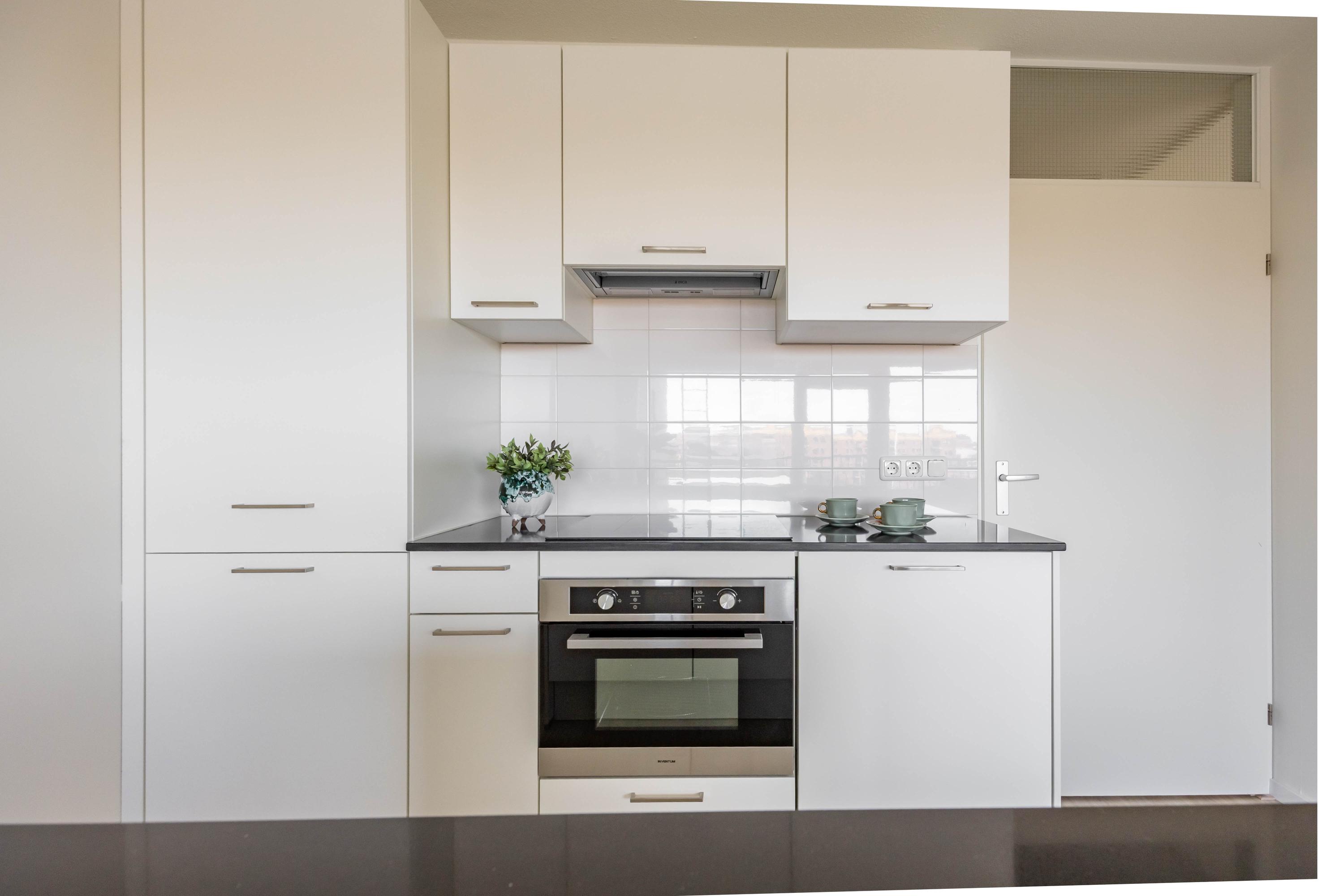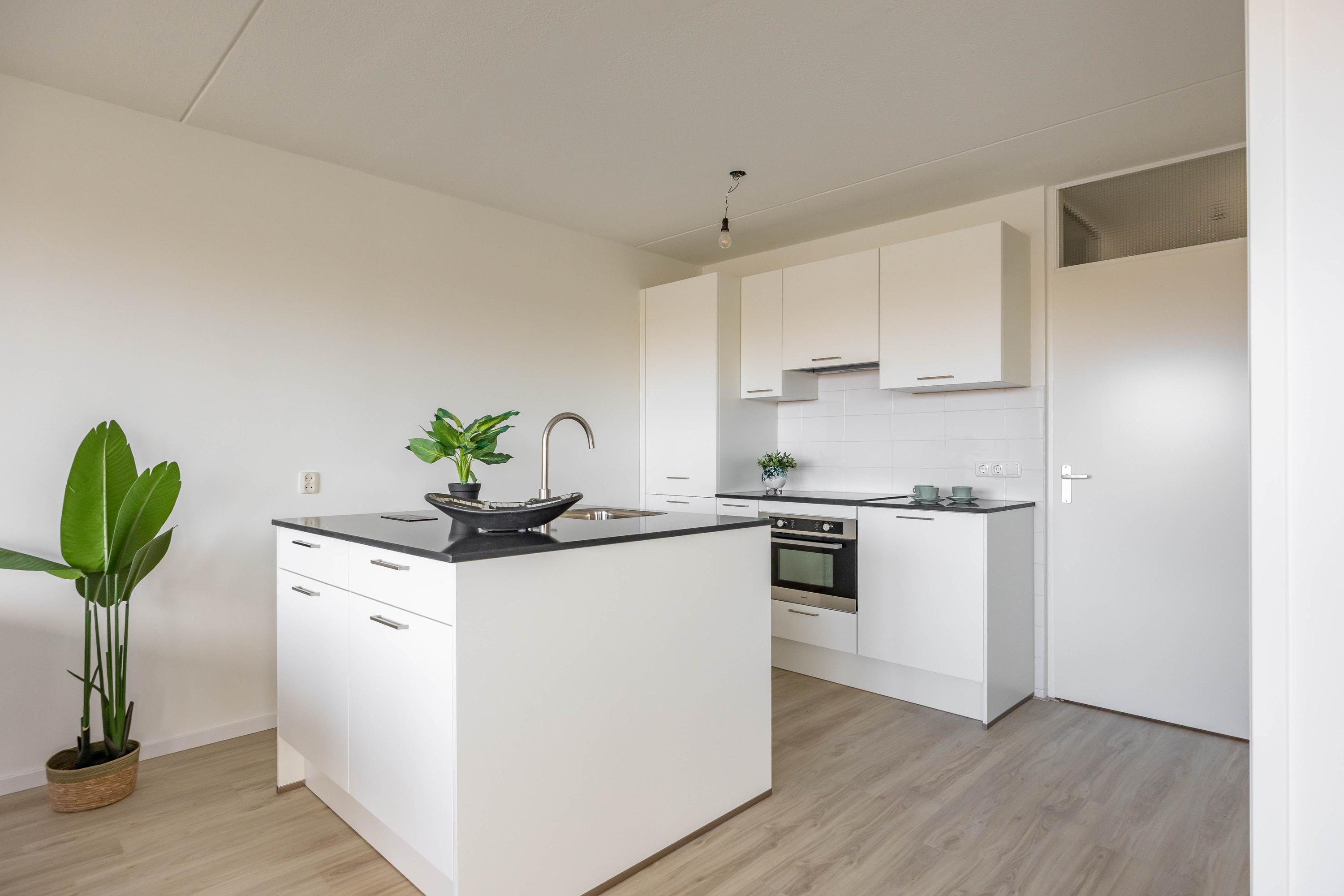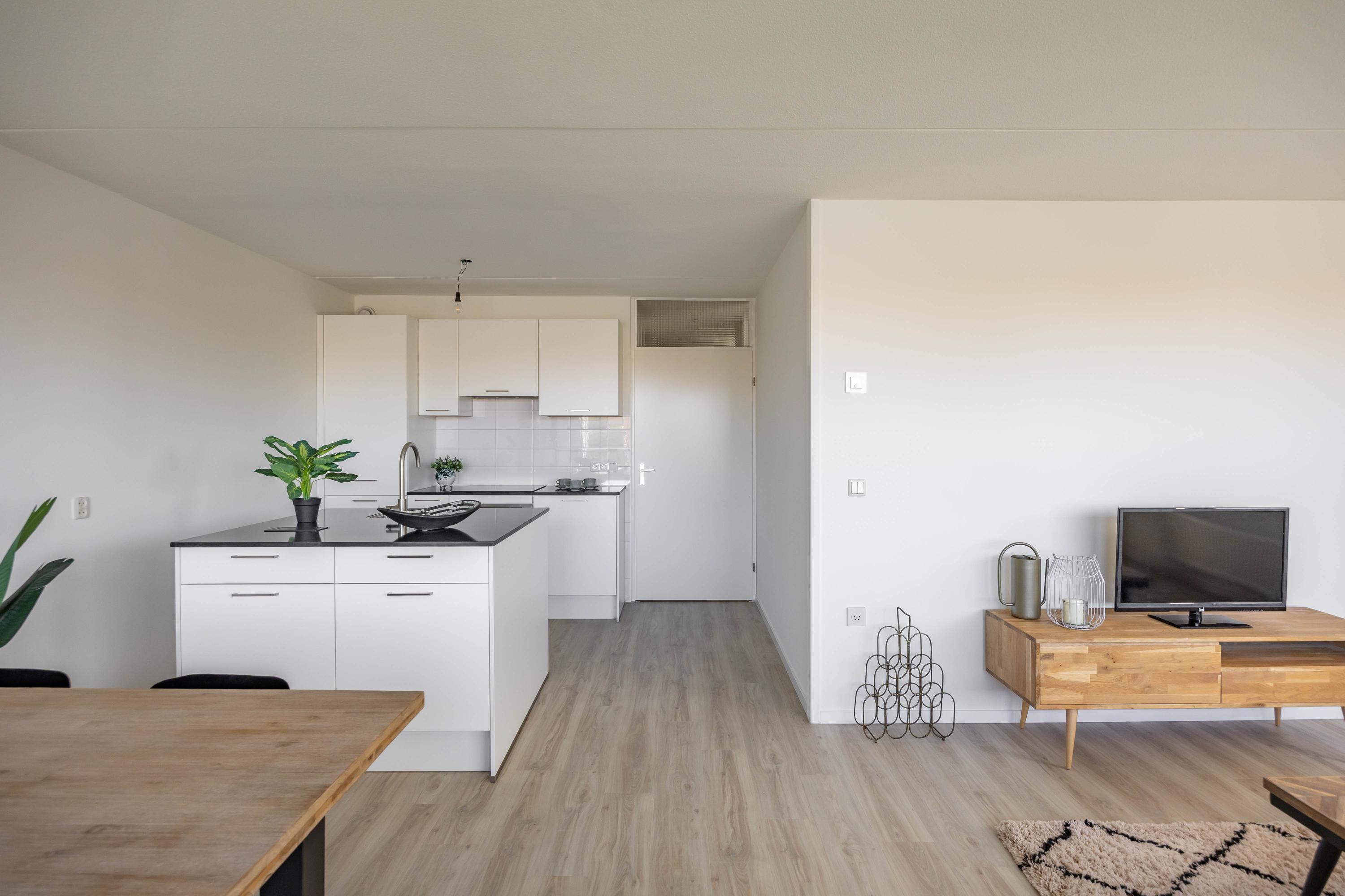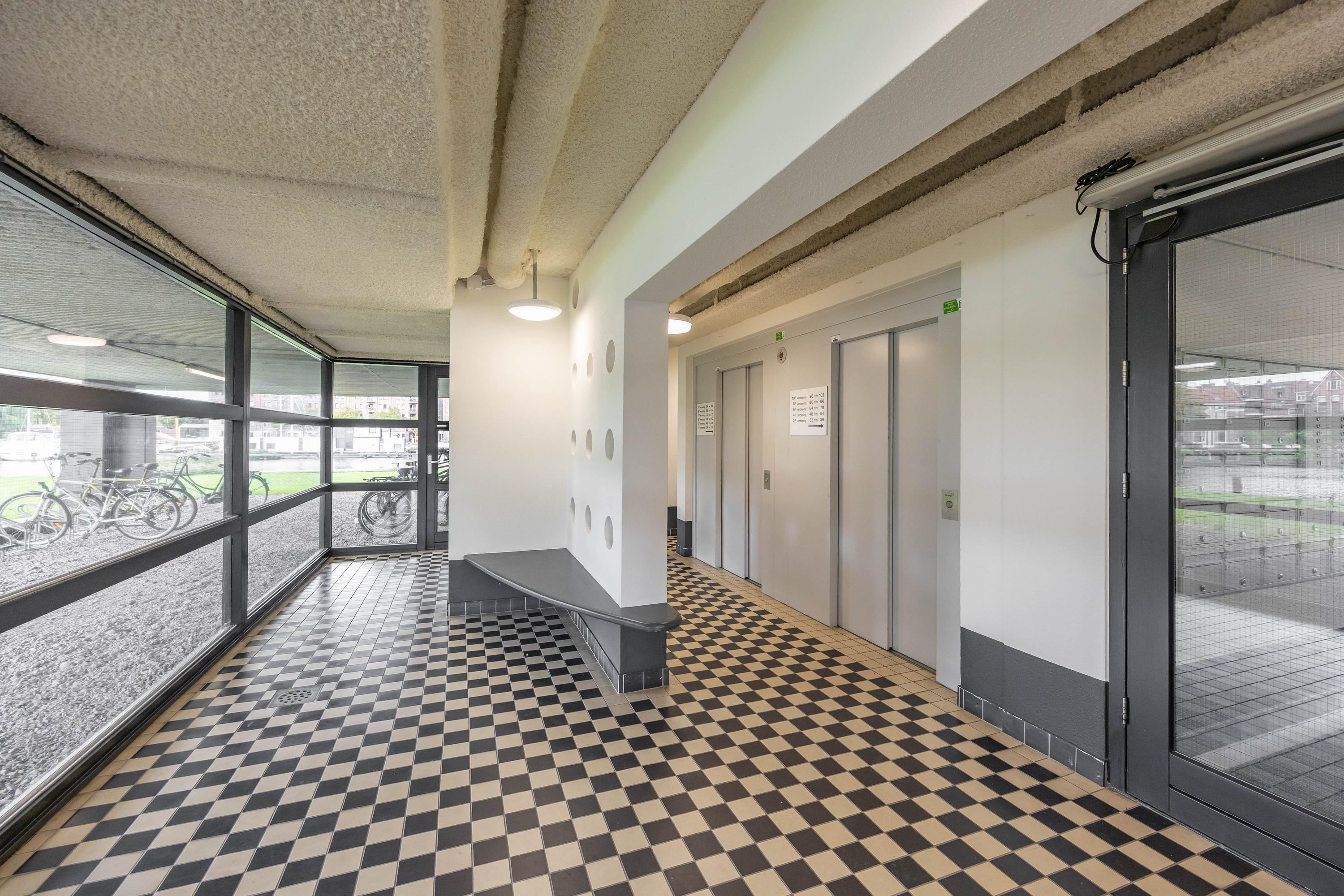 Indeling: entree, lift naar vierde woonlaag, entree appartement, gang met toilet, badkamer, twee slaapkamers, woonkamer met open keuken, toegang tot balkon. Op de begane grond is een fietsenberging.