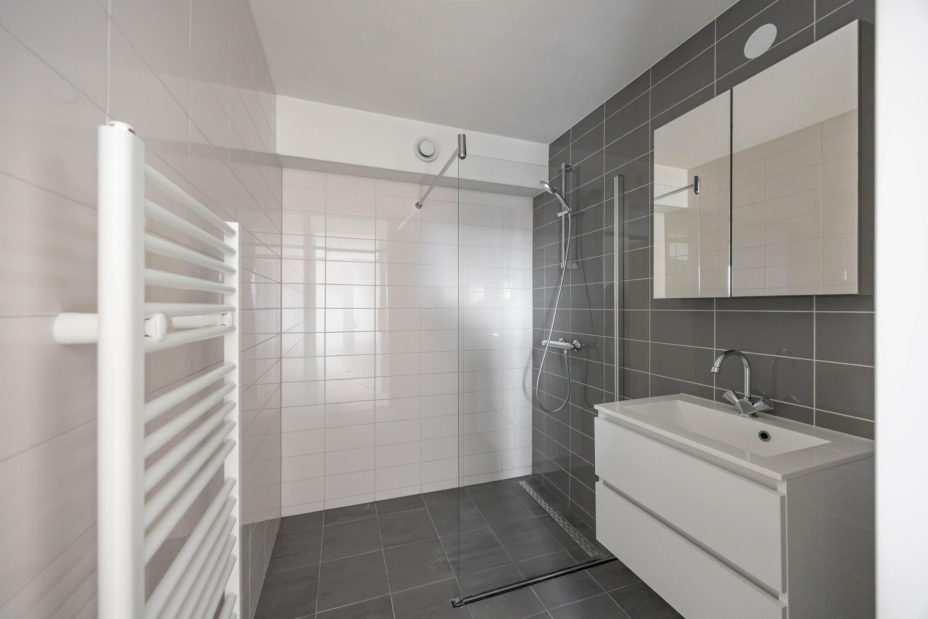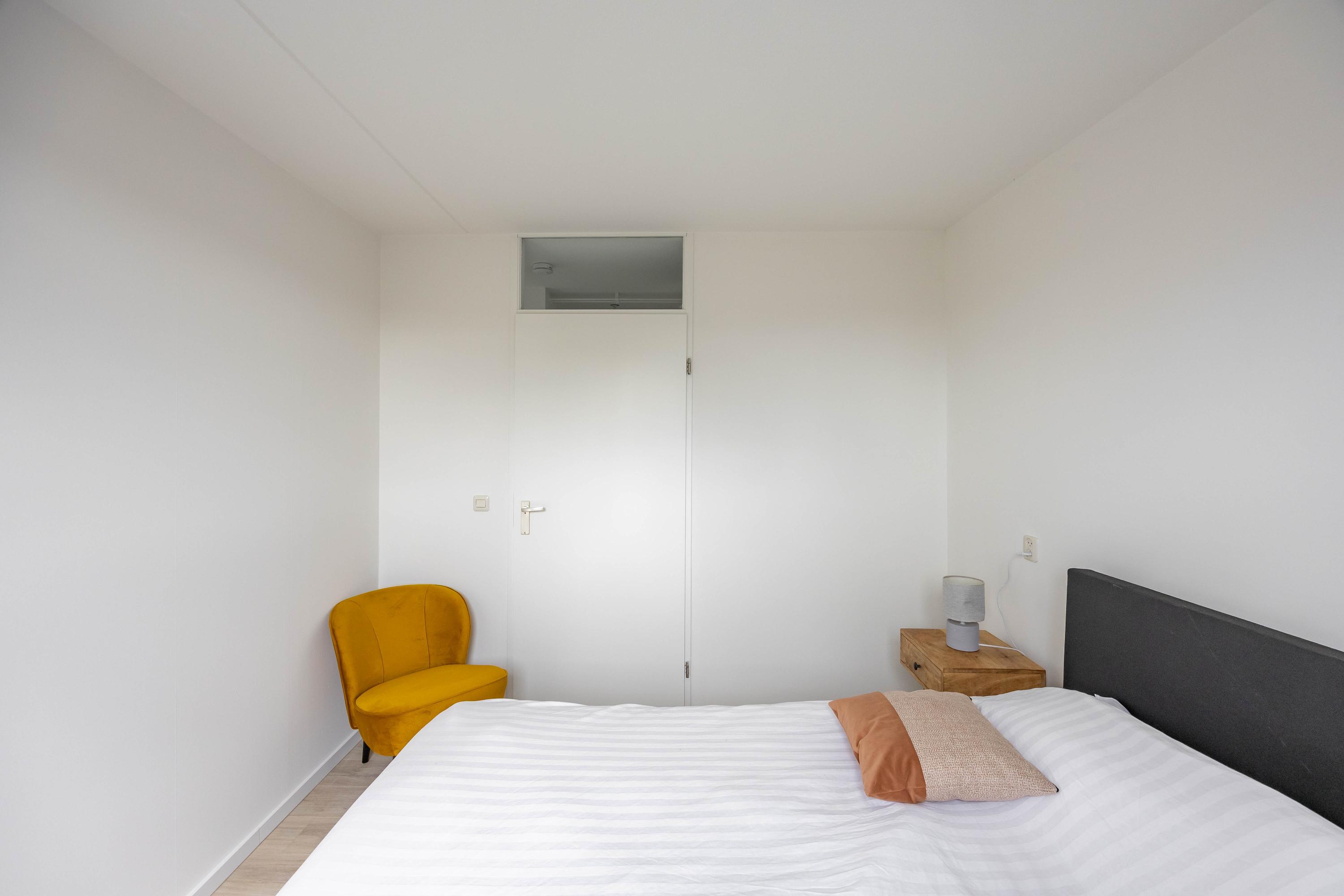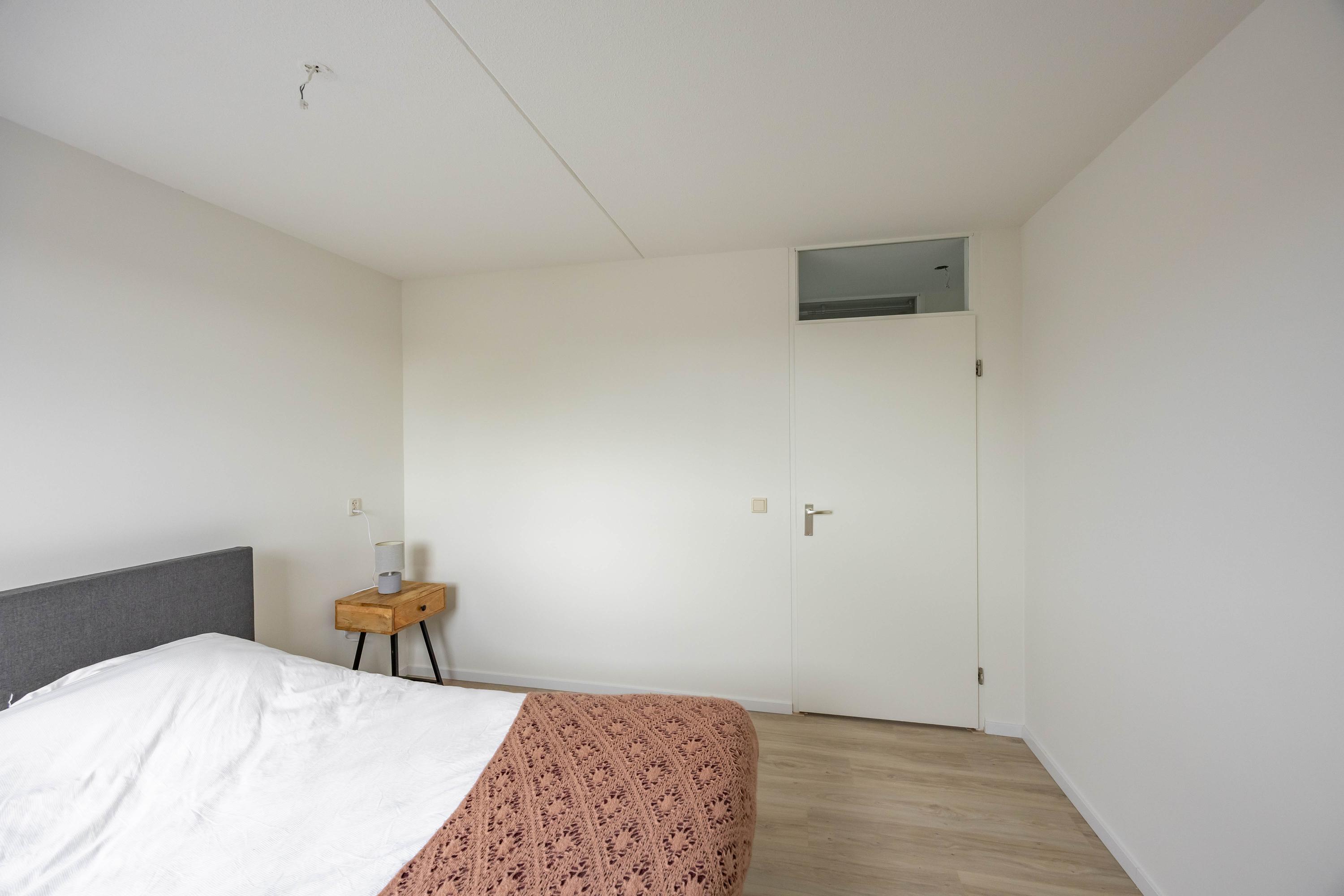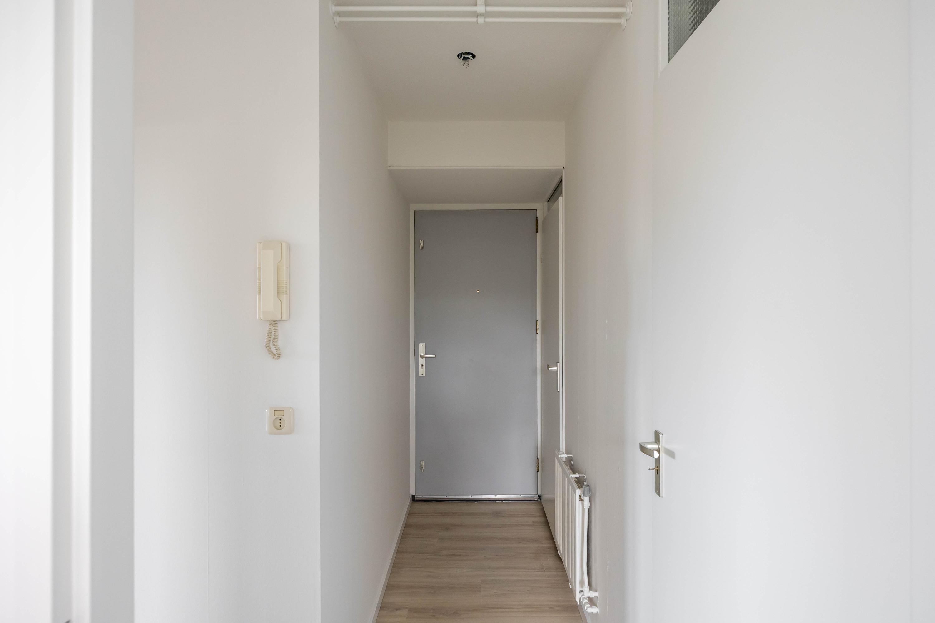Indeling: entree, lift naar vierde woonlaag, entree appartement, gang met toilet, badkamer, twee slaapkamers, woonkamer met open keuken, toegang tot balkon. Op de begane grond is een fietsenberging.