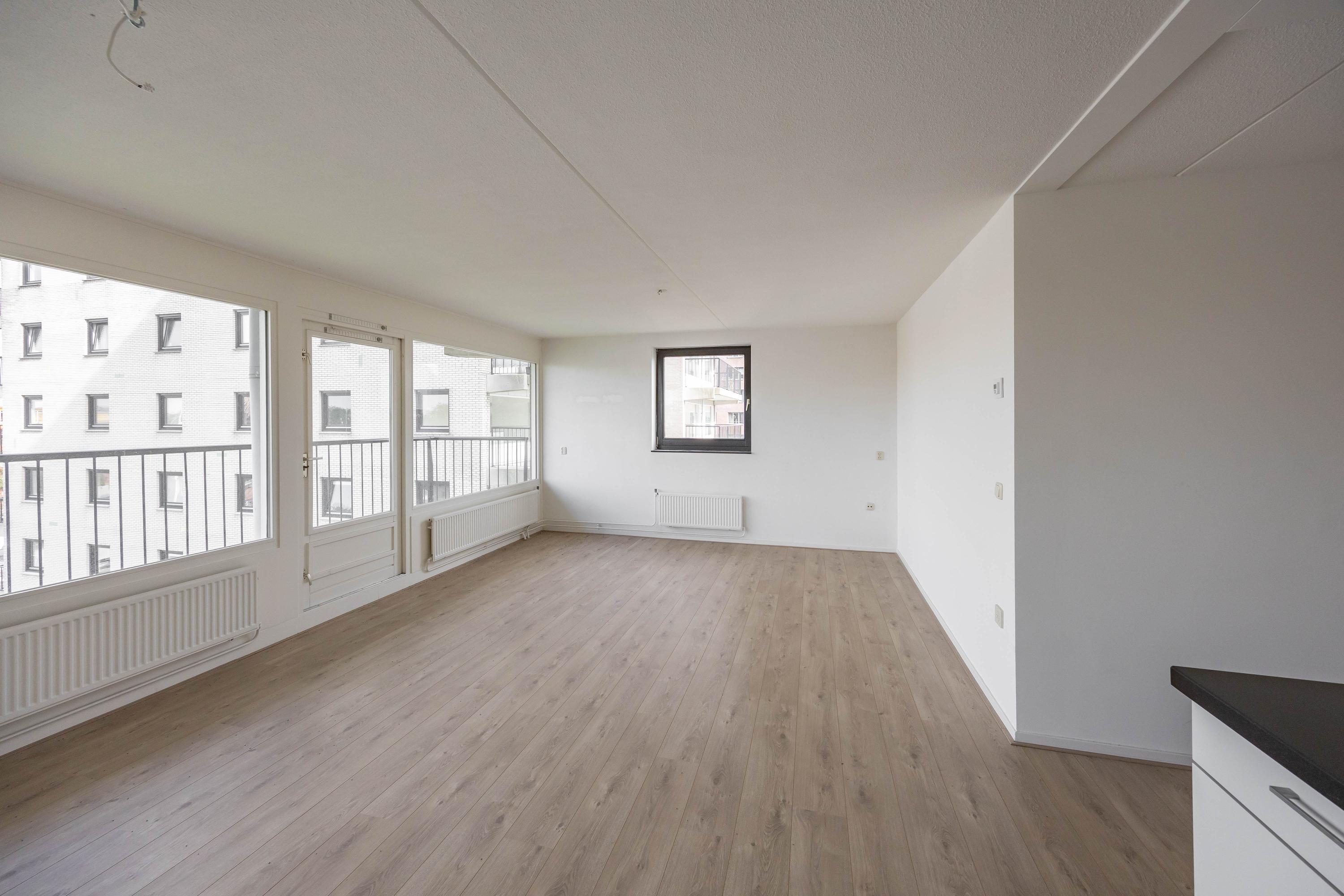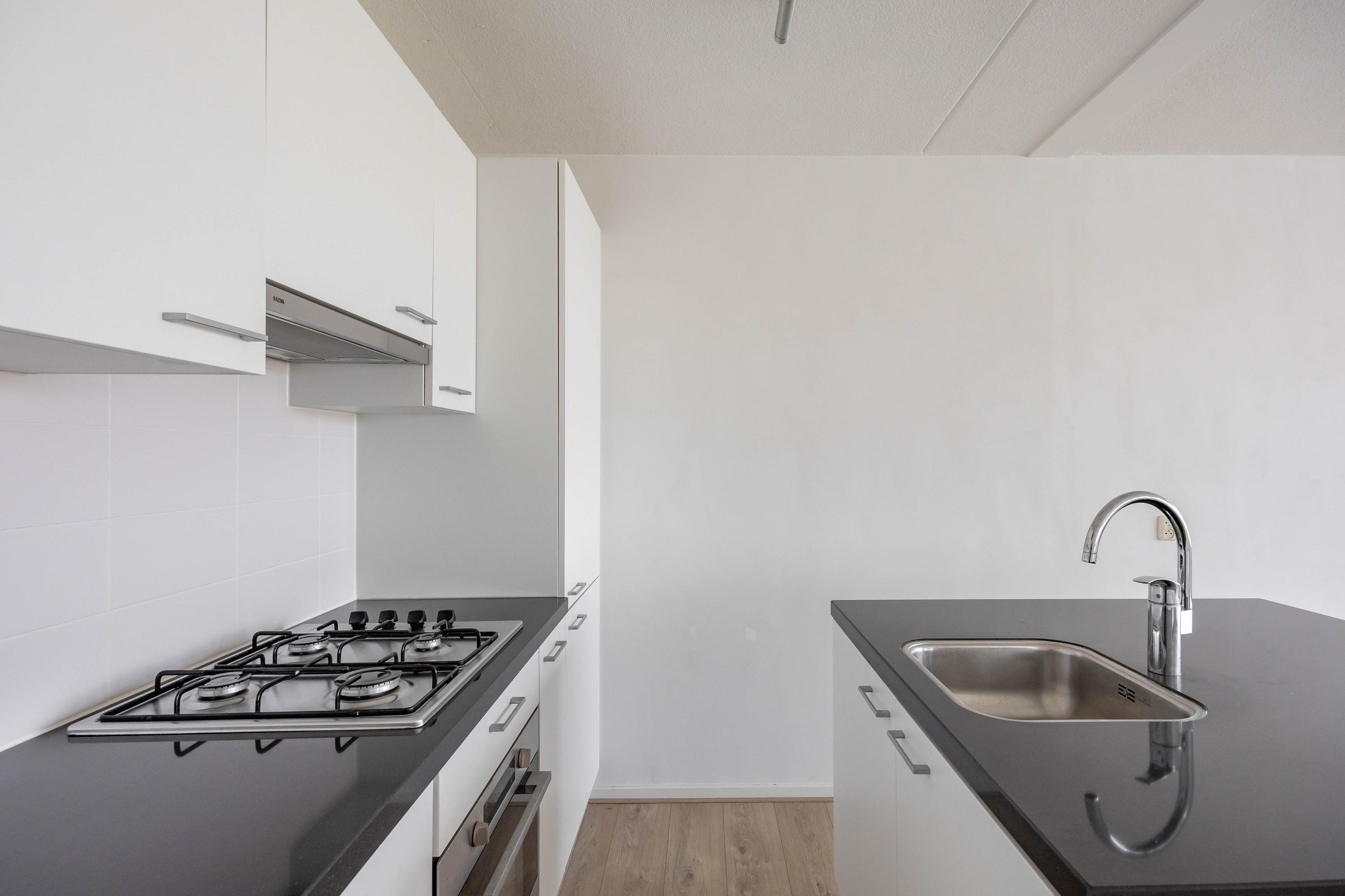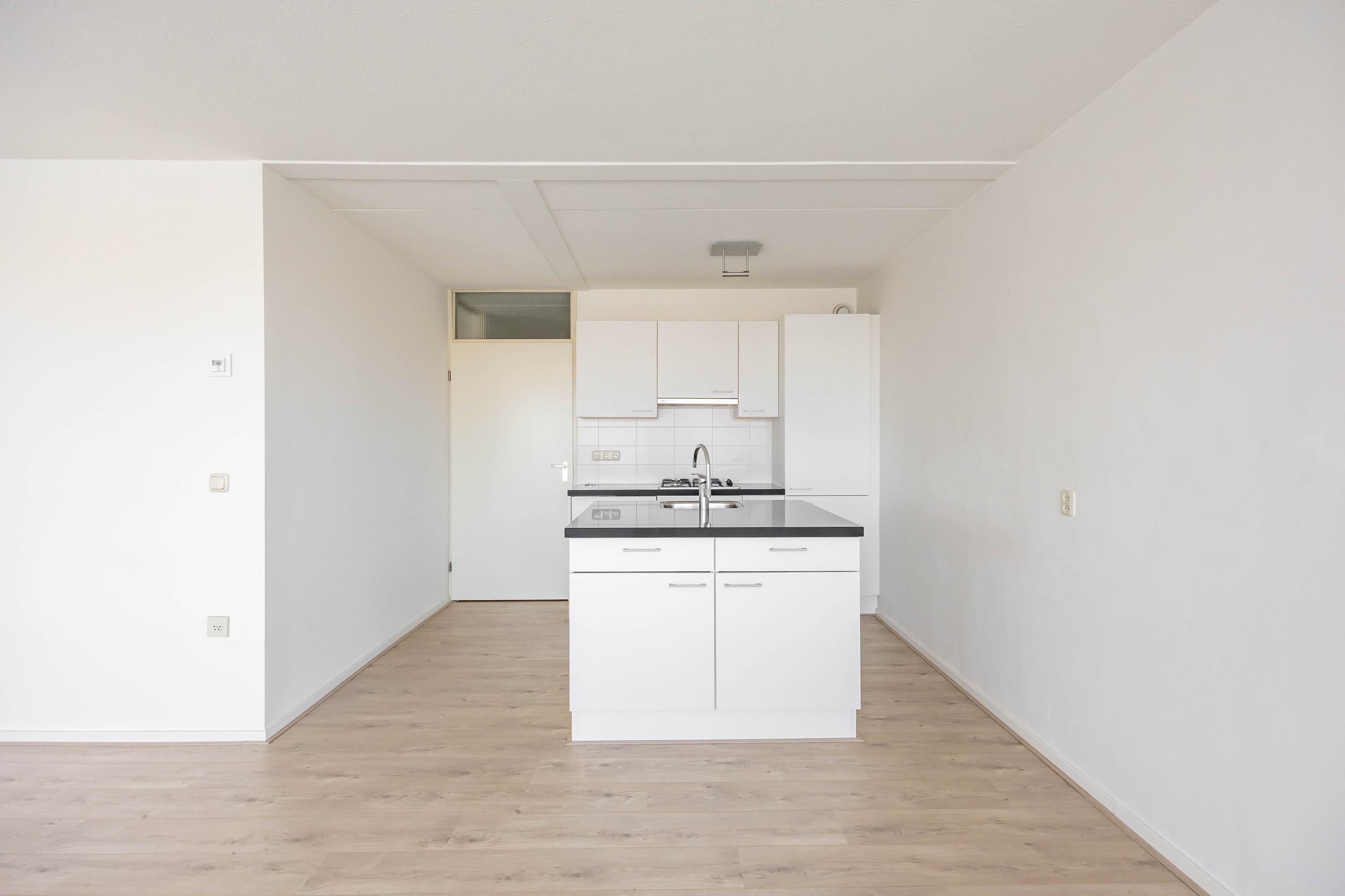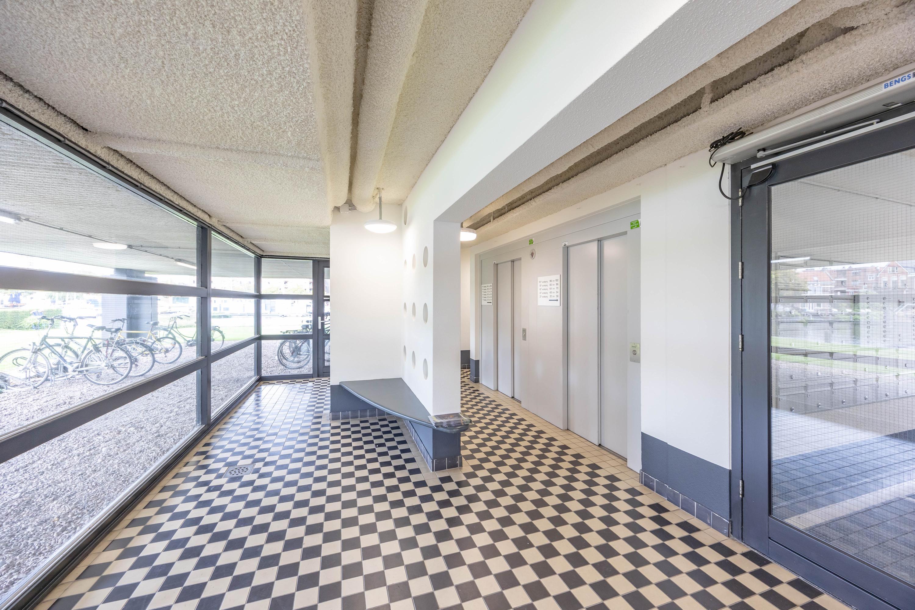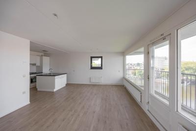 Indeling: entree, lift naar vijfde woonlaag, entree appartement, gang met toilet, badkamer, twee slaapkamers woonkamer met open keuken, toegang tot balkon. Op de begane grond is een fietsenberging.