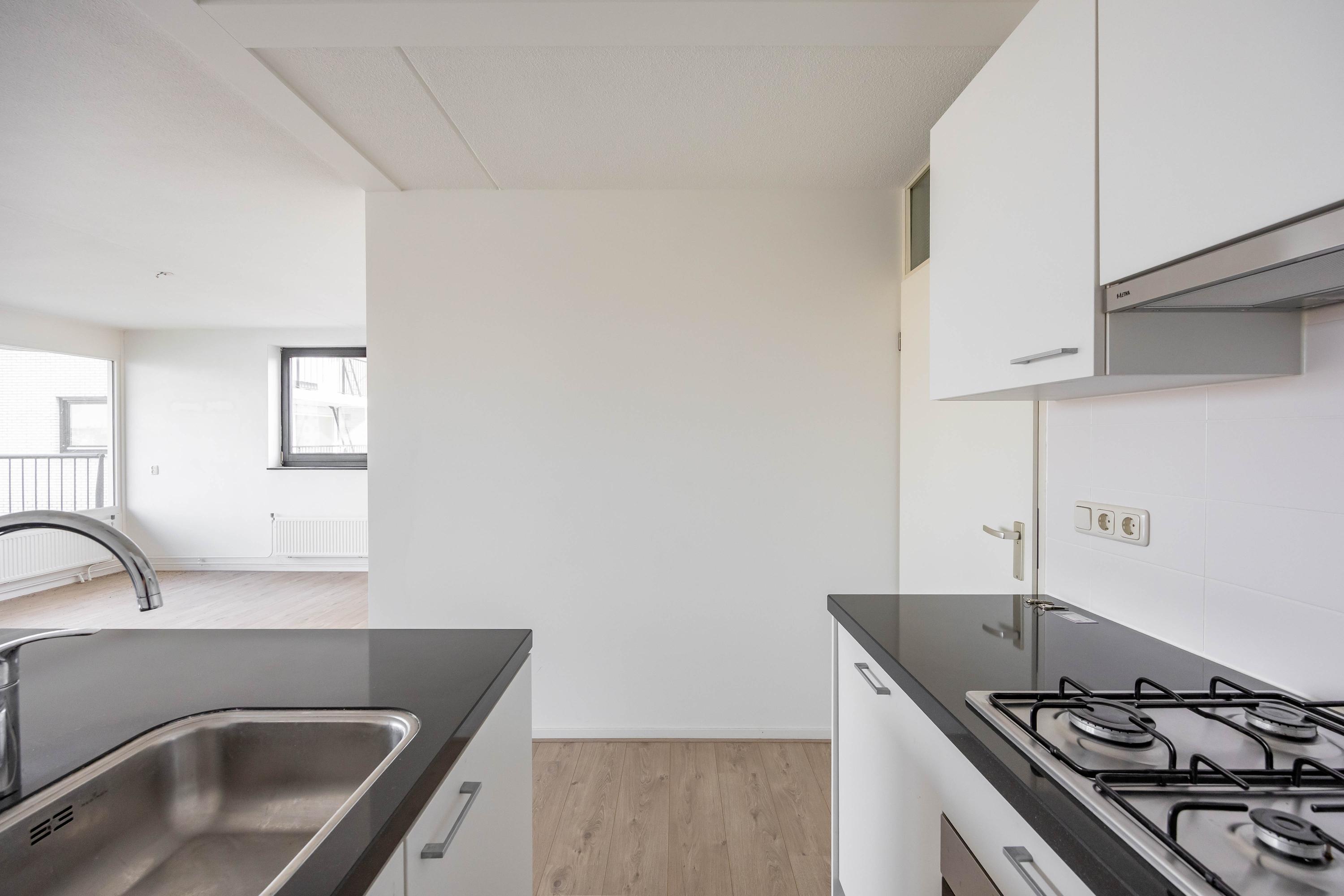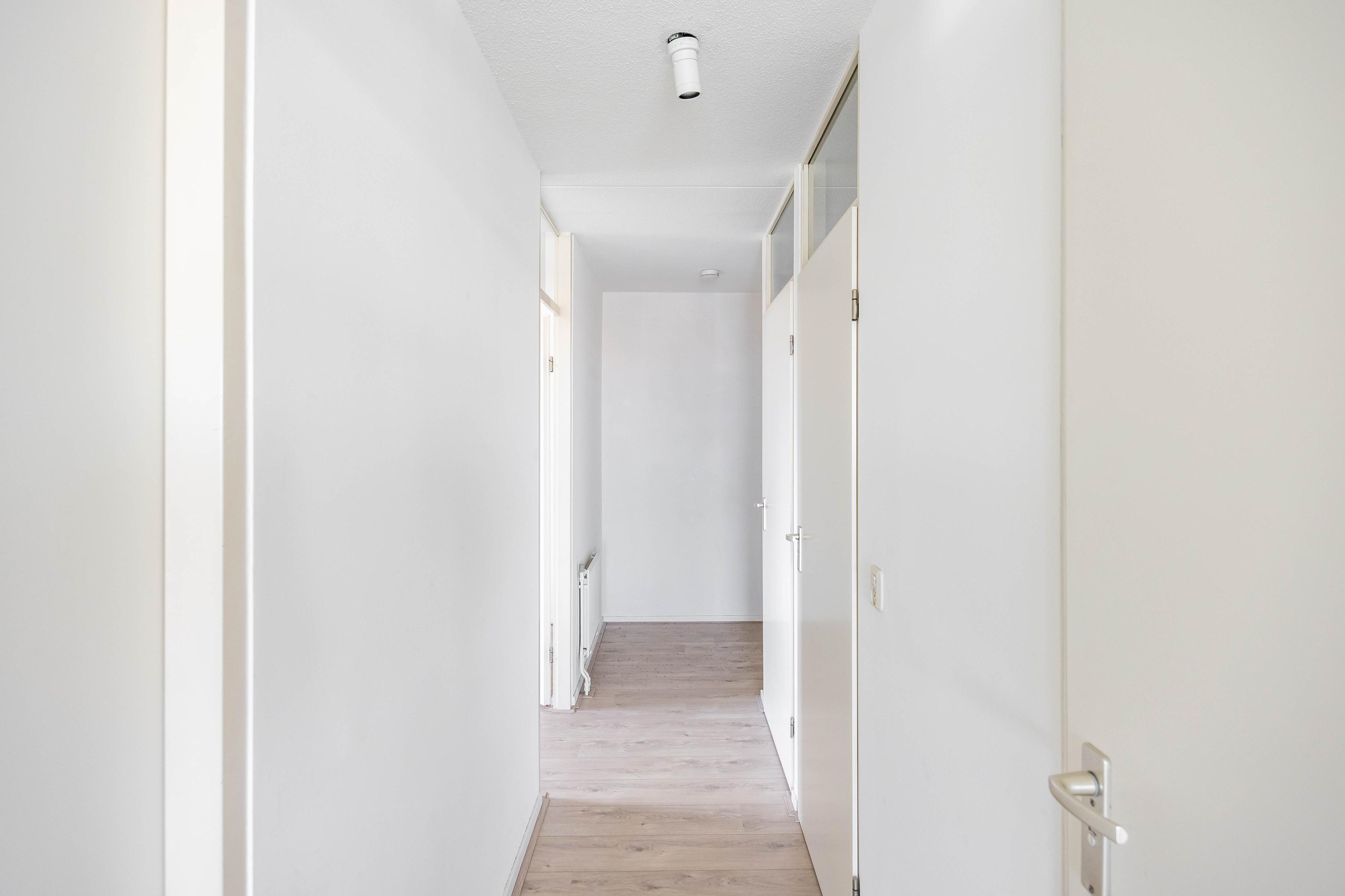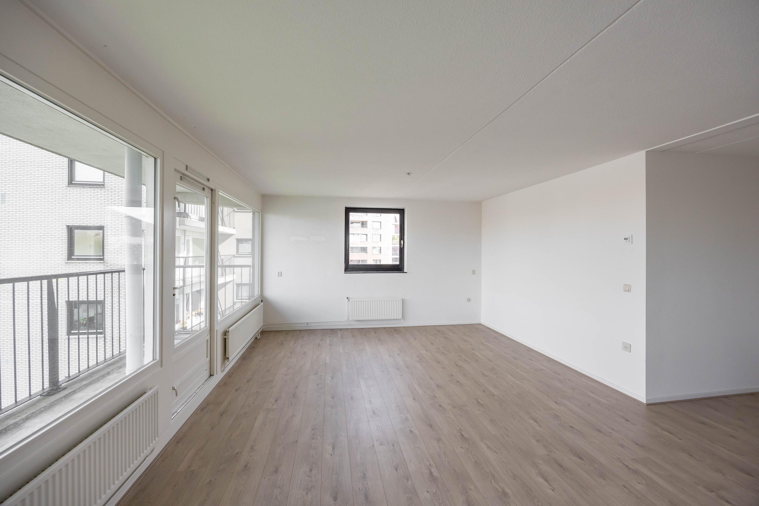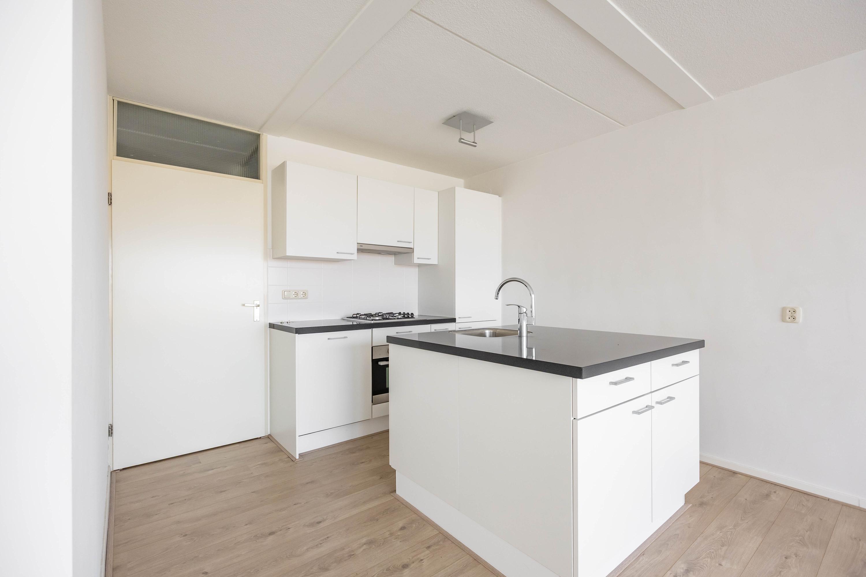 Indeling: entree, lift naar vijfde woonlaag, entree appartement, gang met toilet, badkamer, twee slaapkamers woonkamer met open keuken, toegang tot balkon. Op de begane grond is een fietsenberging.