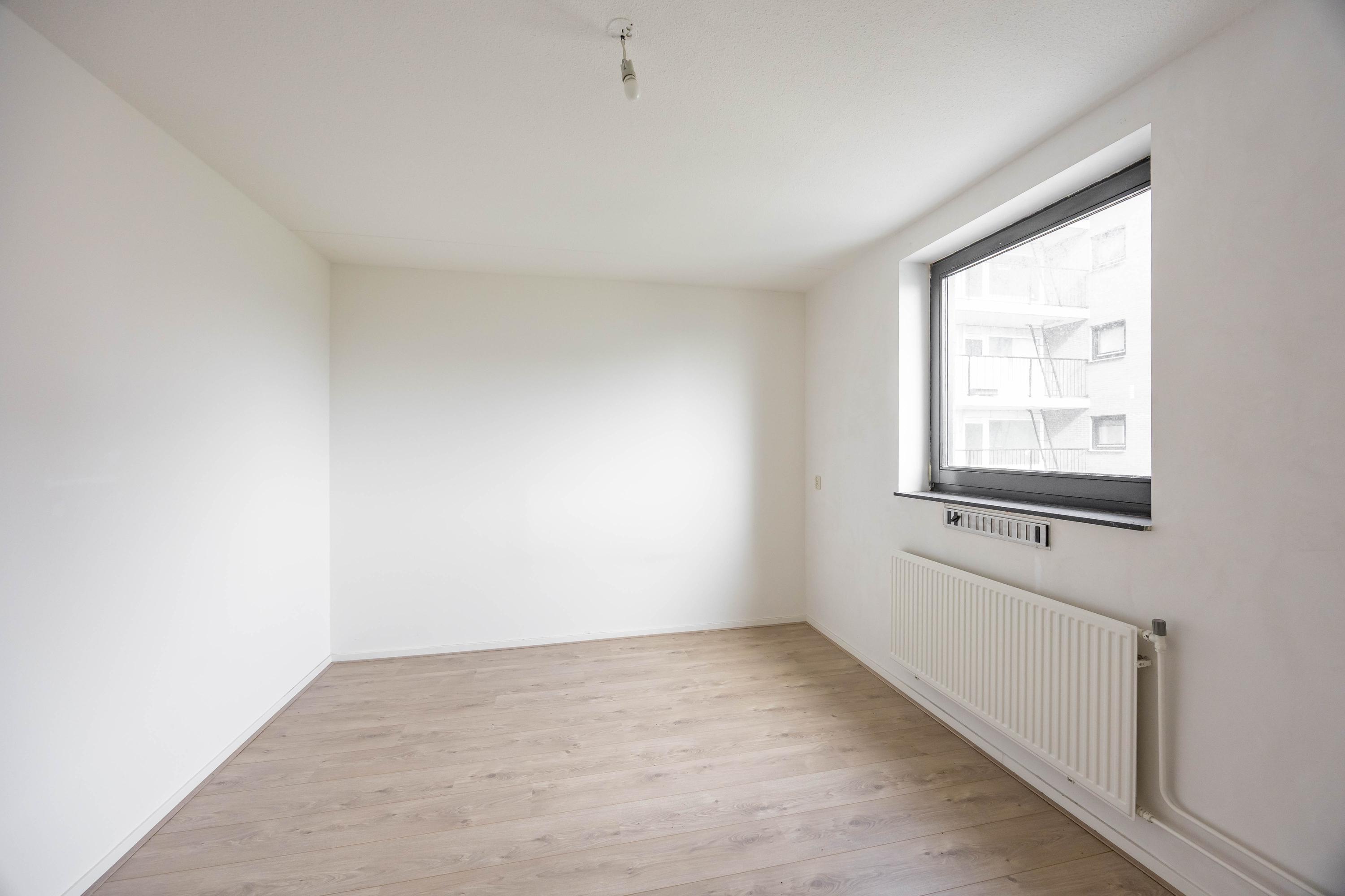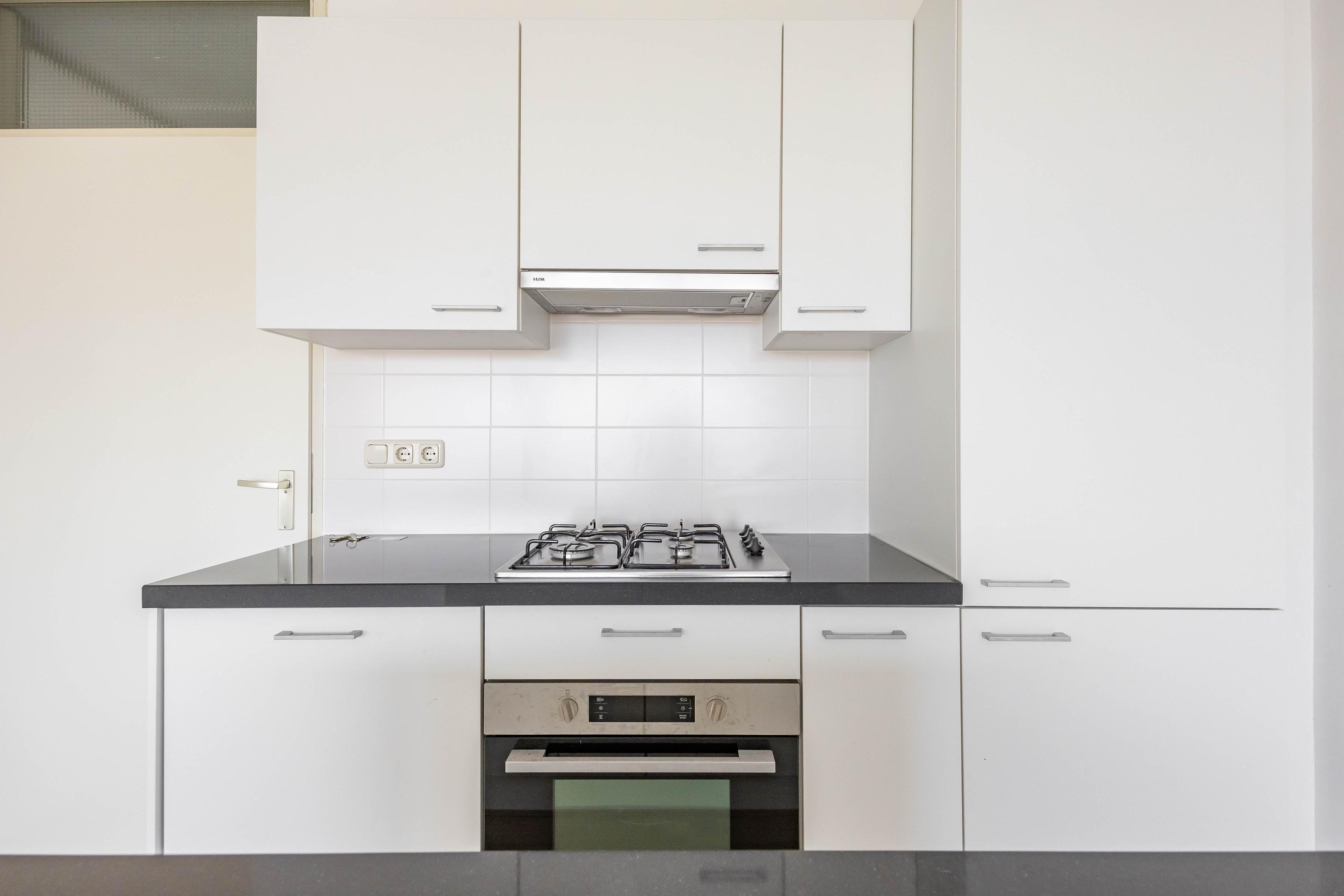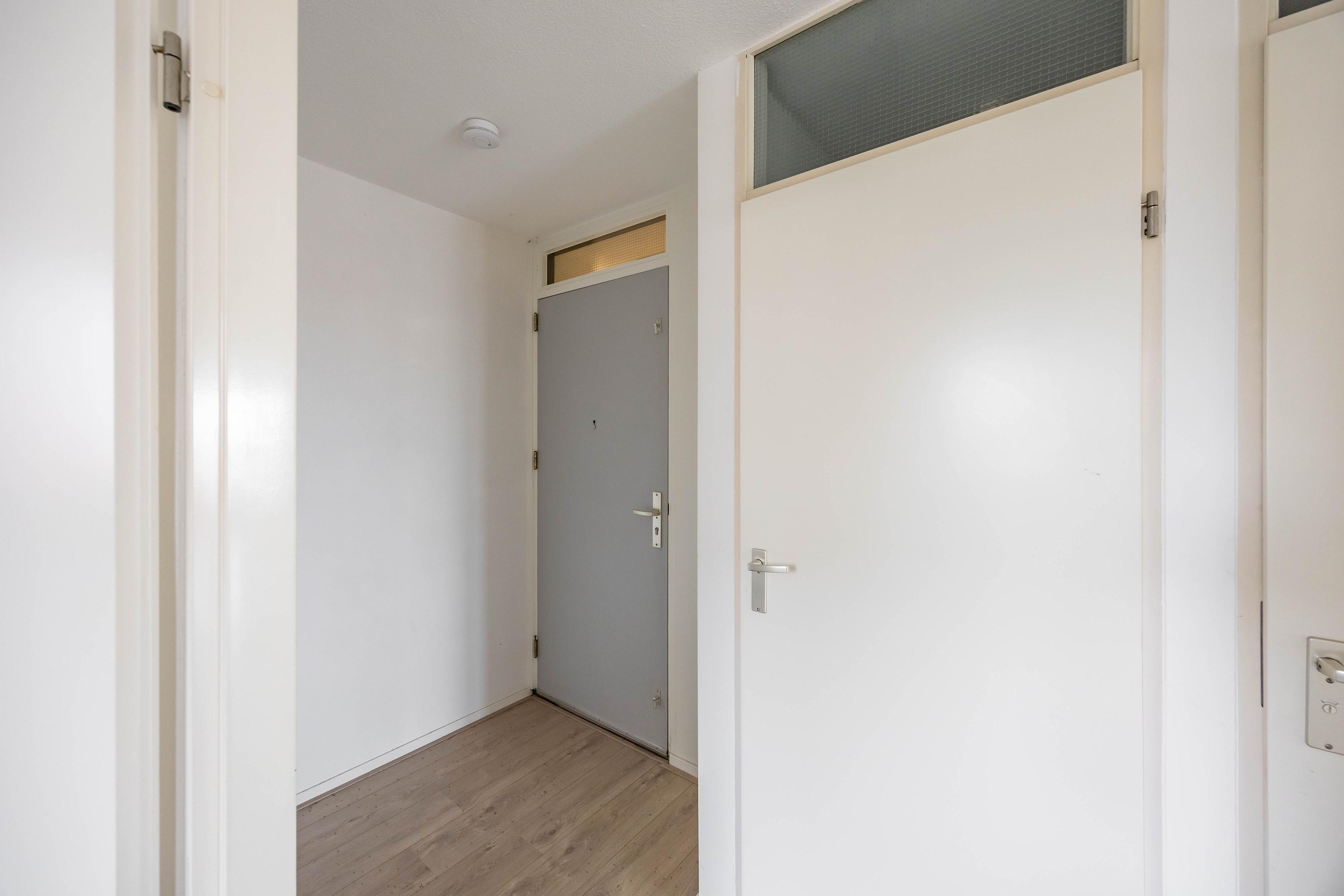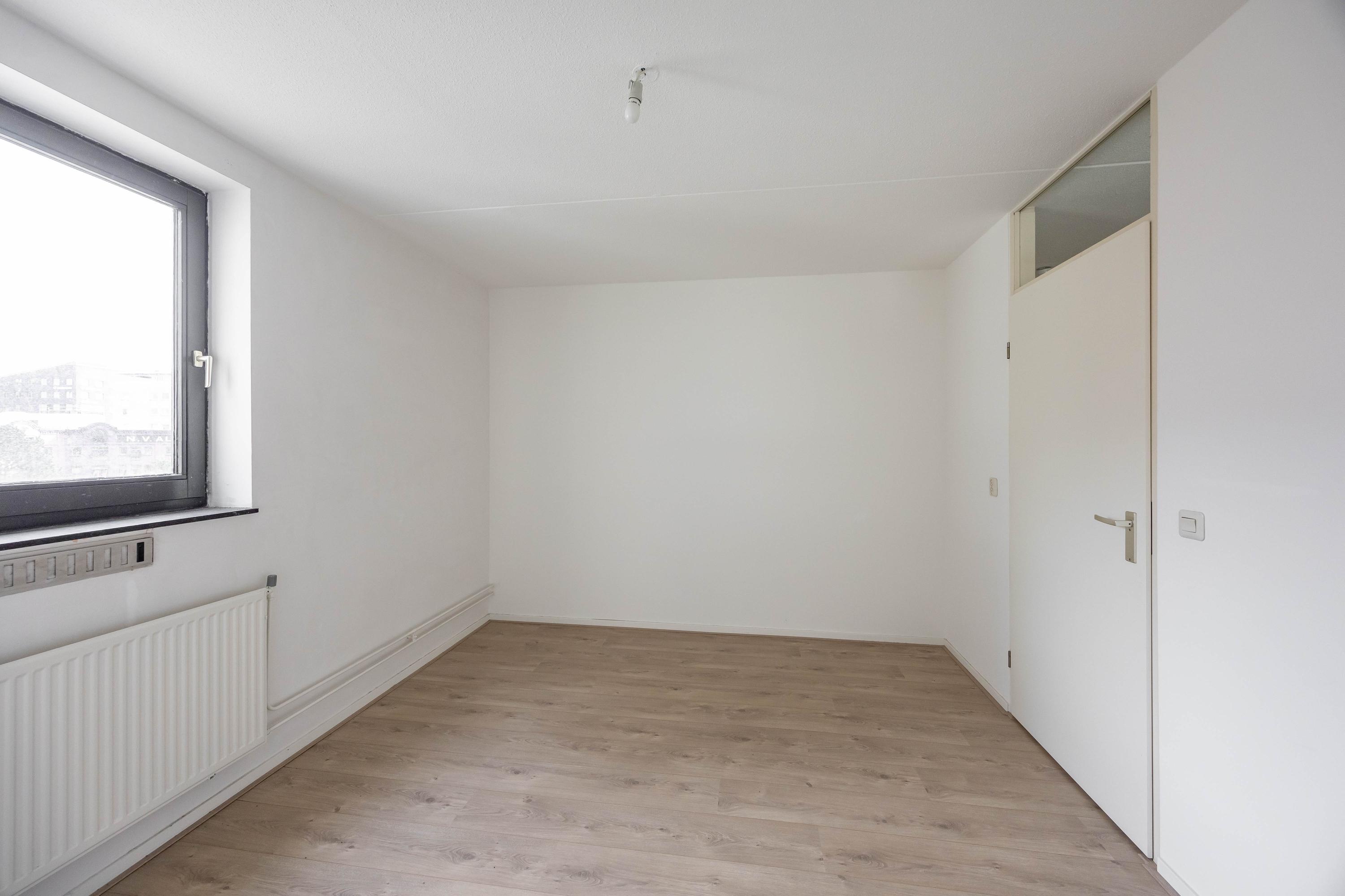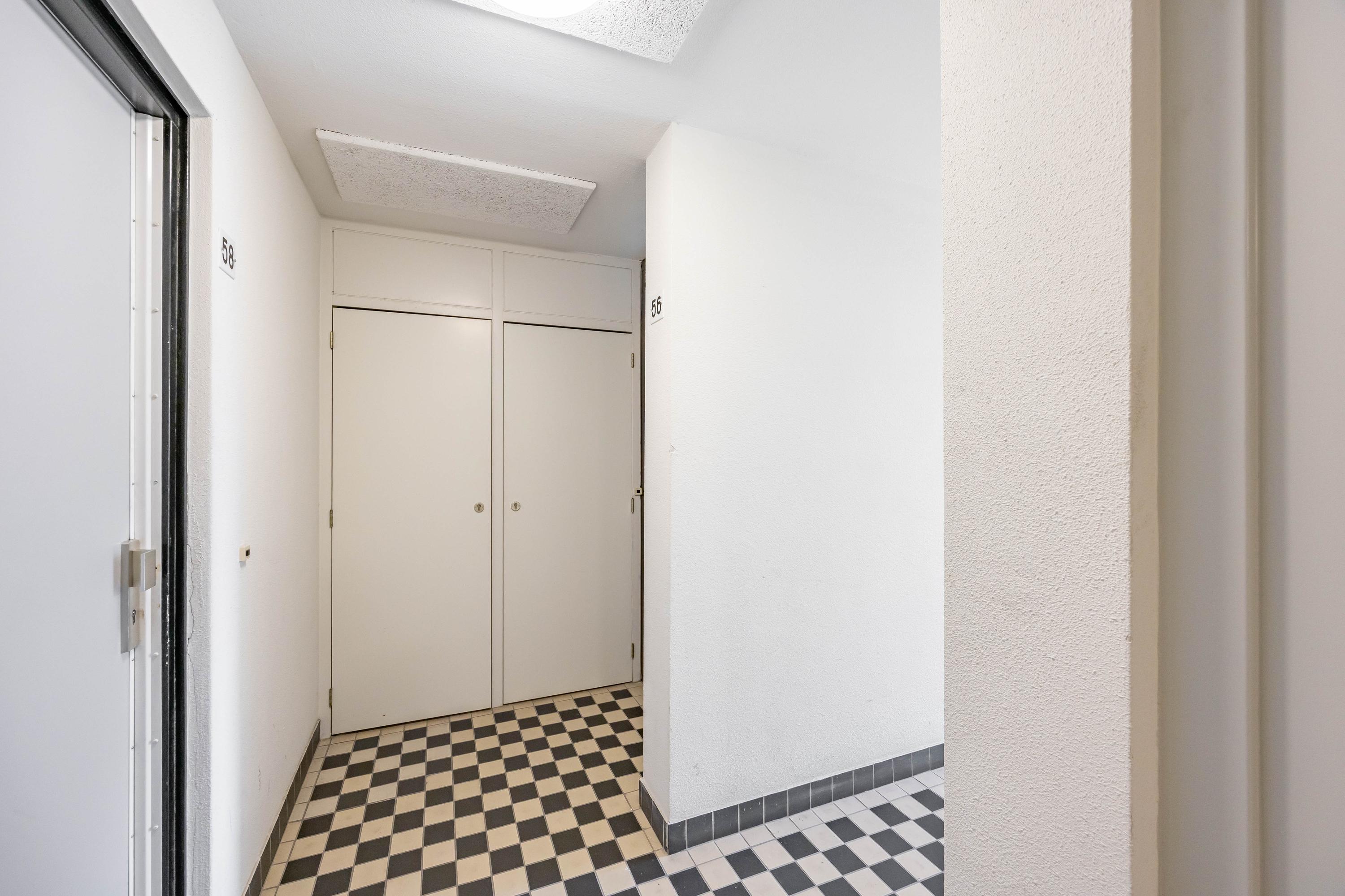 Indeling: entree, lift naar vijfde woonlaag, entree appartement, gang met toilet, badkamer, twee slaapkamers woonkamer met open keuken, toegang tot balkon. Op de begane grond is een fietsenberging.