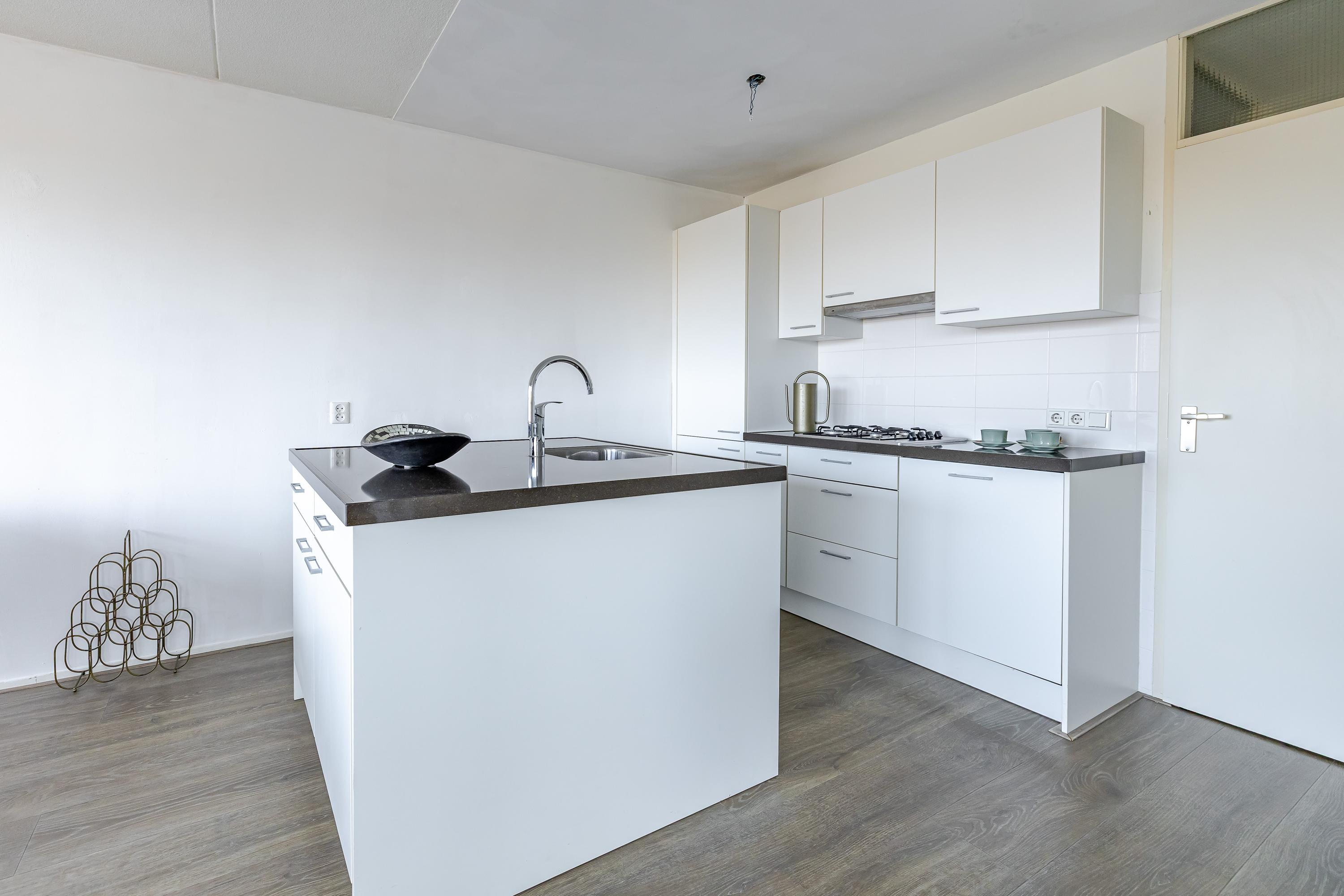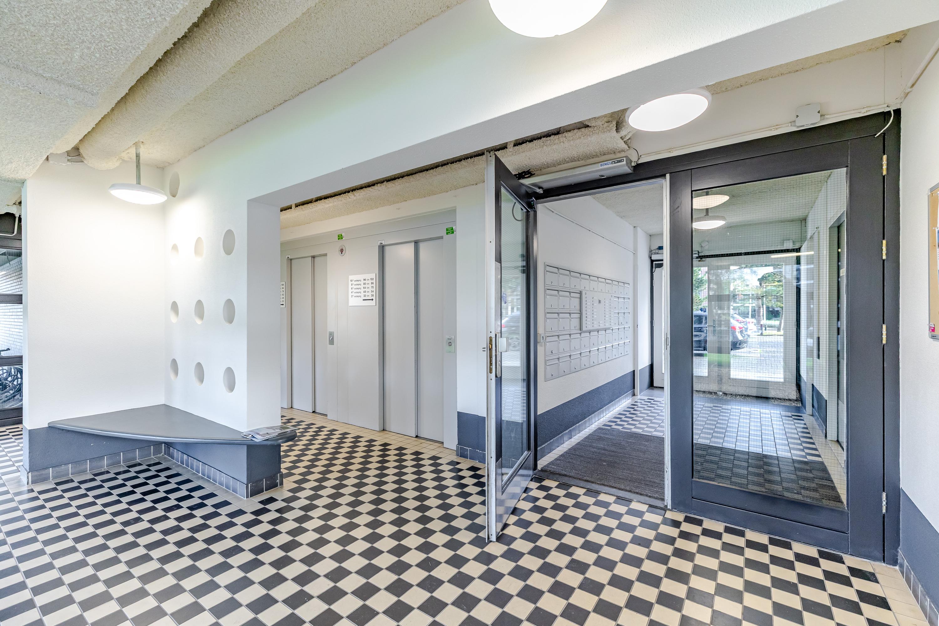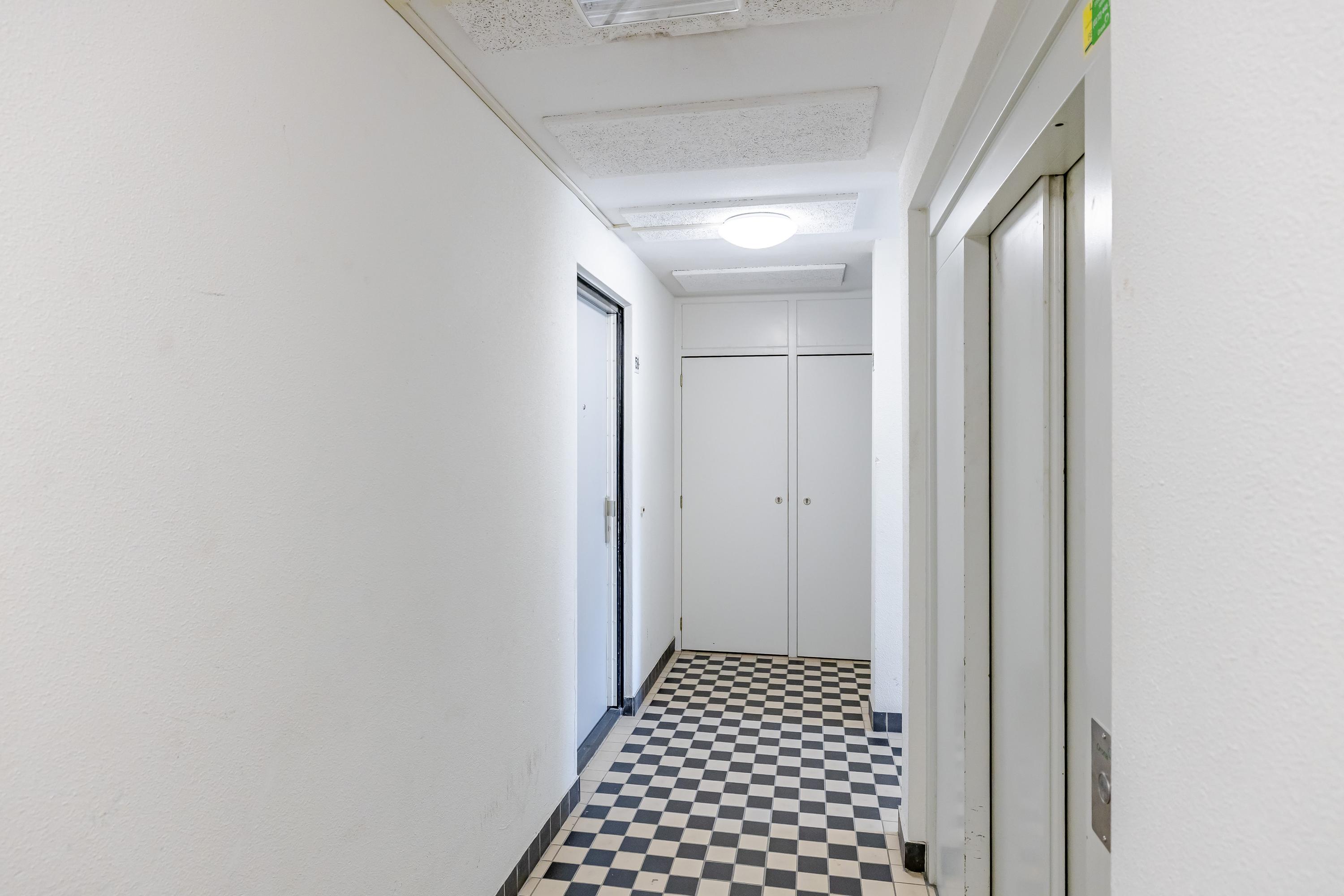 Indeling: entree, lift naar vijfde woonlaag, entree appartement, gang met toilet, badkamer, twee slaapkamers, woonkamer met open keuken, toegang tot balkon. Op de begane grond is een fietsenberging.