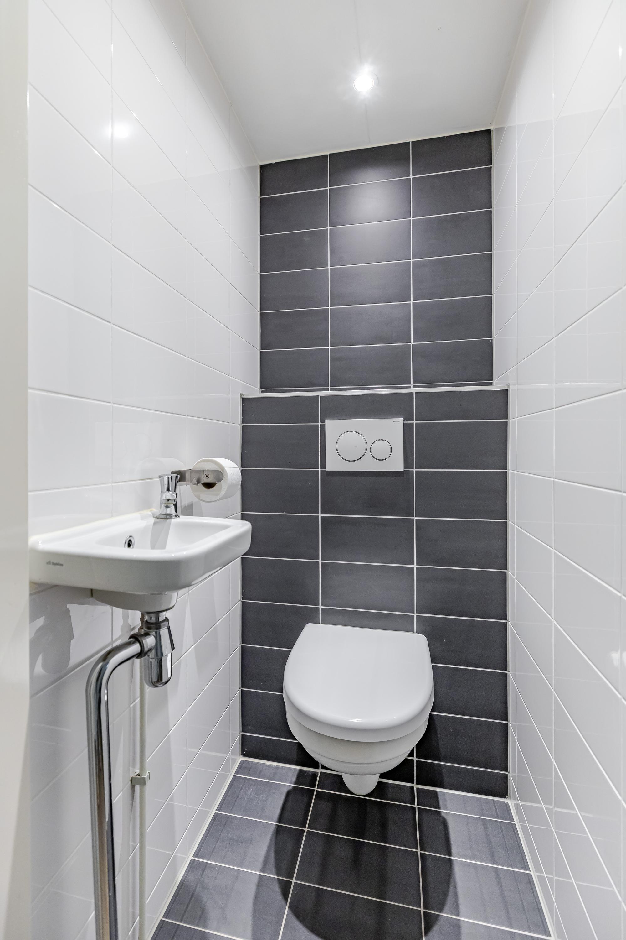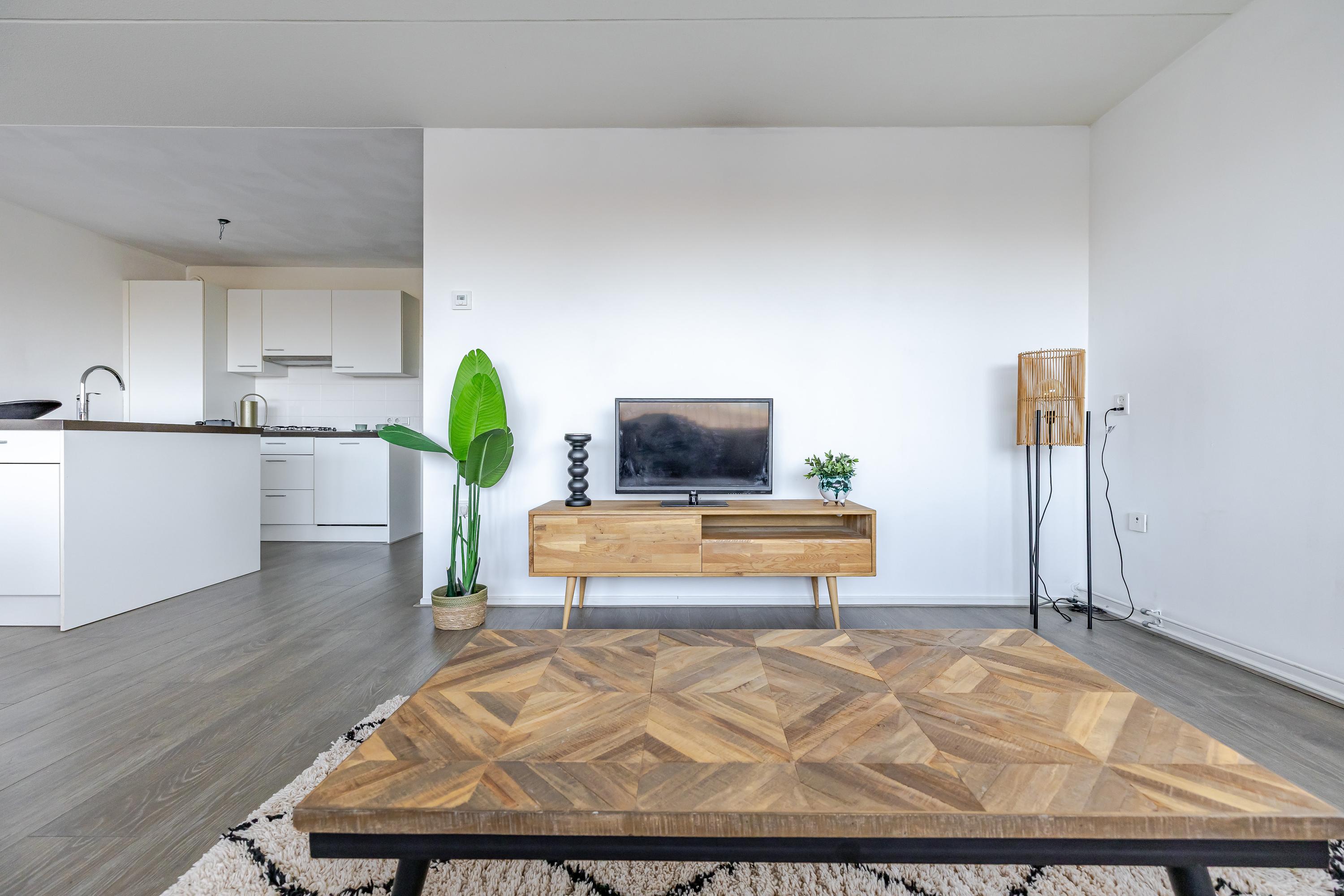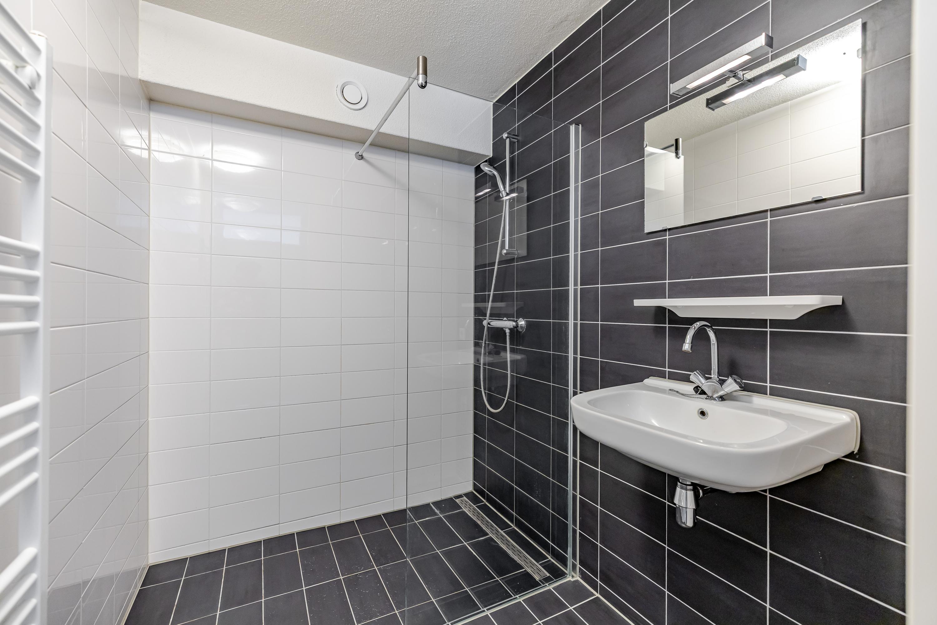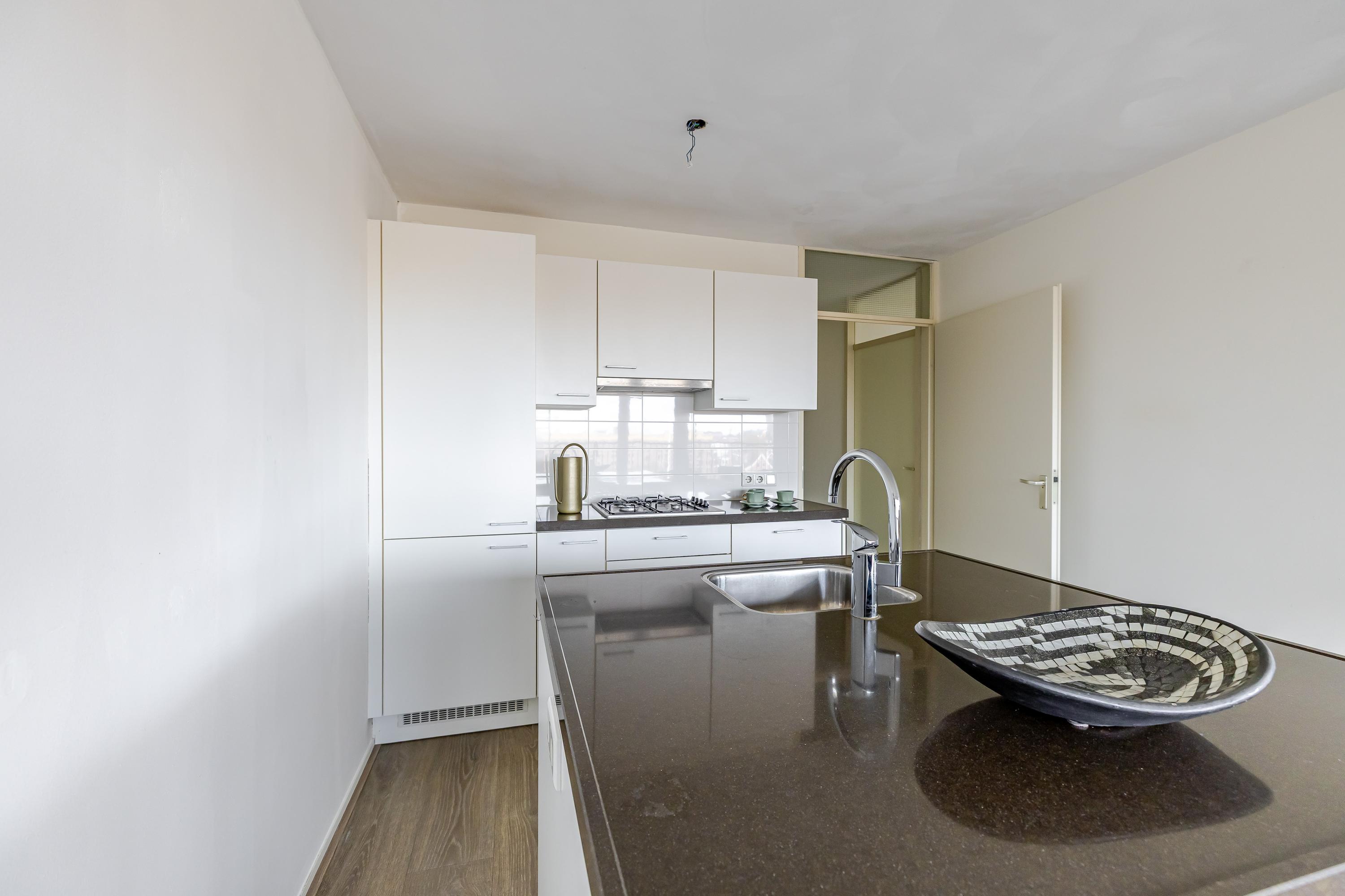 Indeling: entree, lift naar vijfde woonlaag, entree appartement, gang met toilet, badkamer, twee slaapkamers, woonkamer met open keuken, toegang tot balkon. Op de begane grond is een fietsenberging.