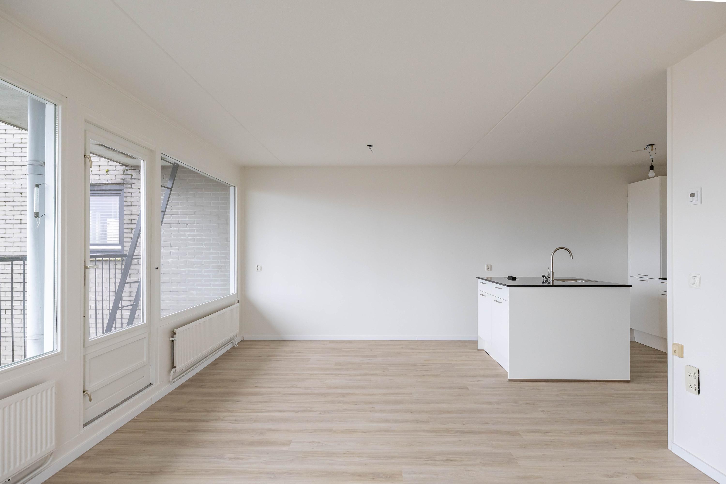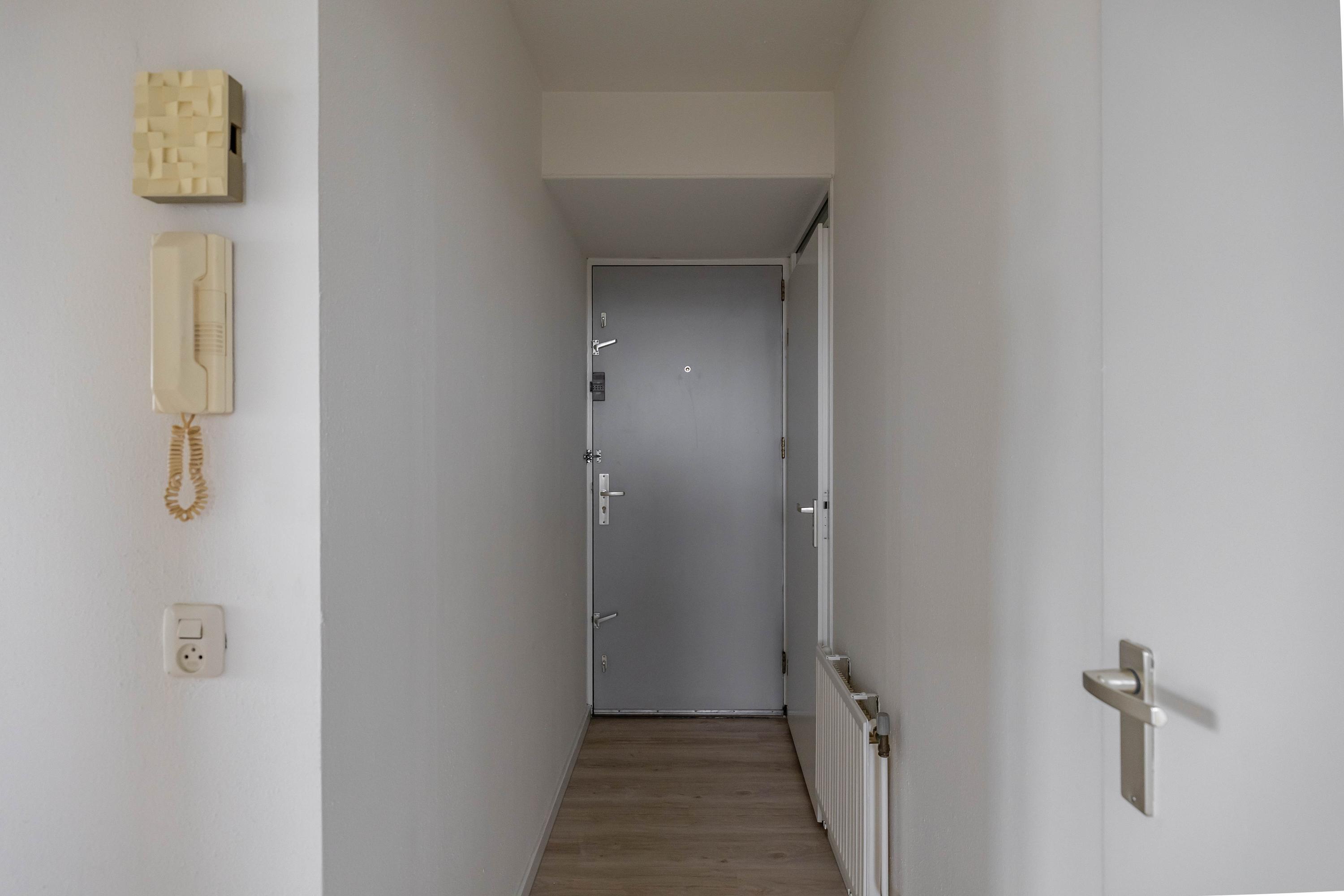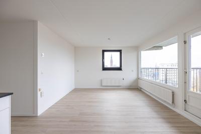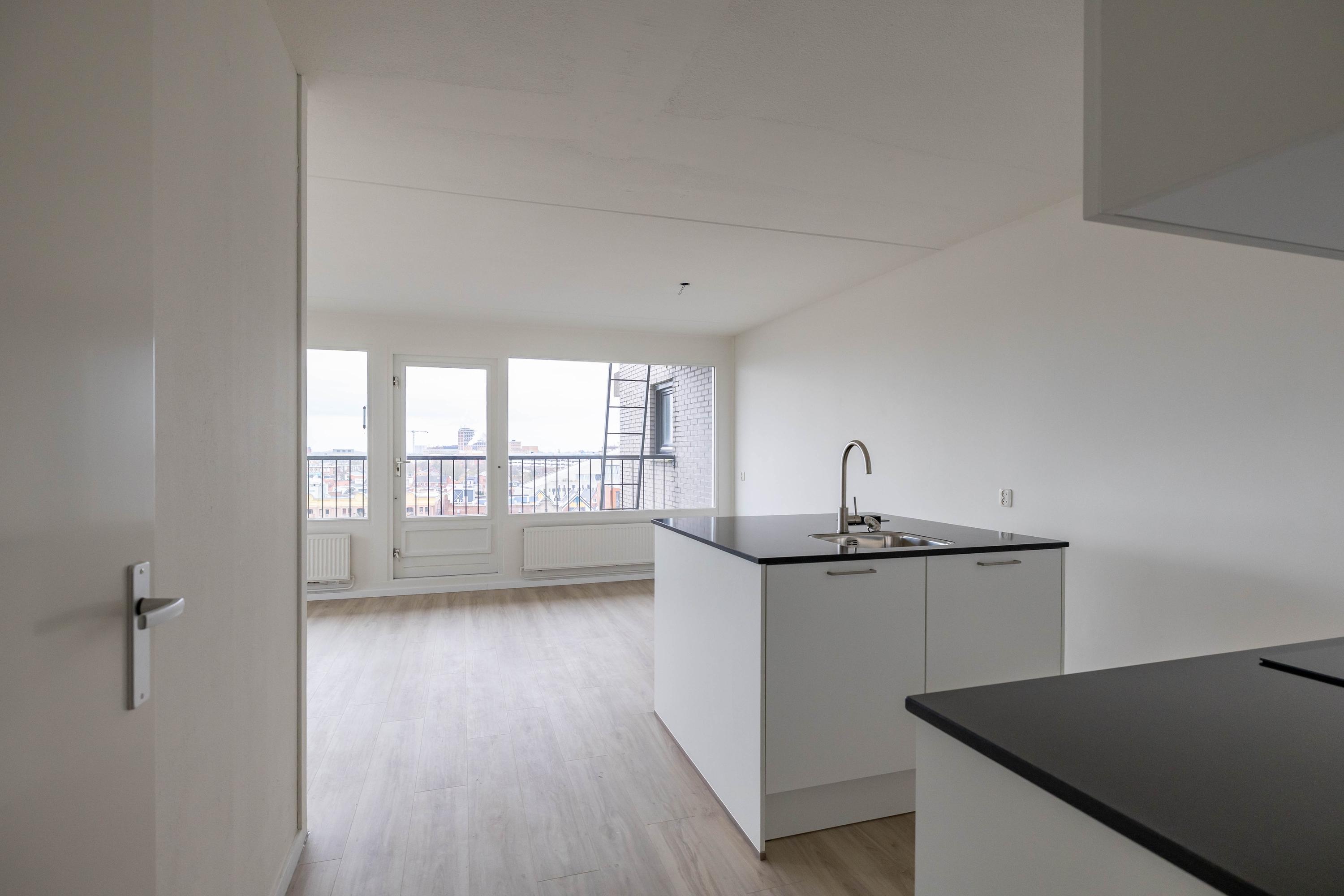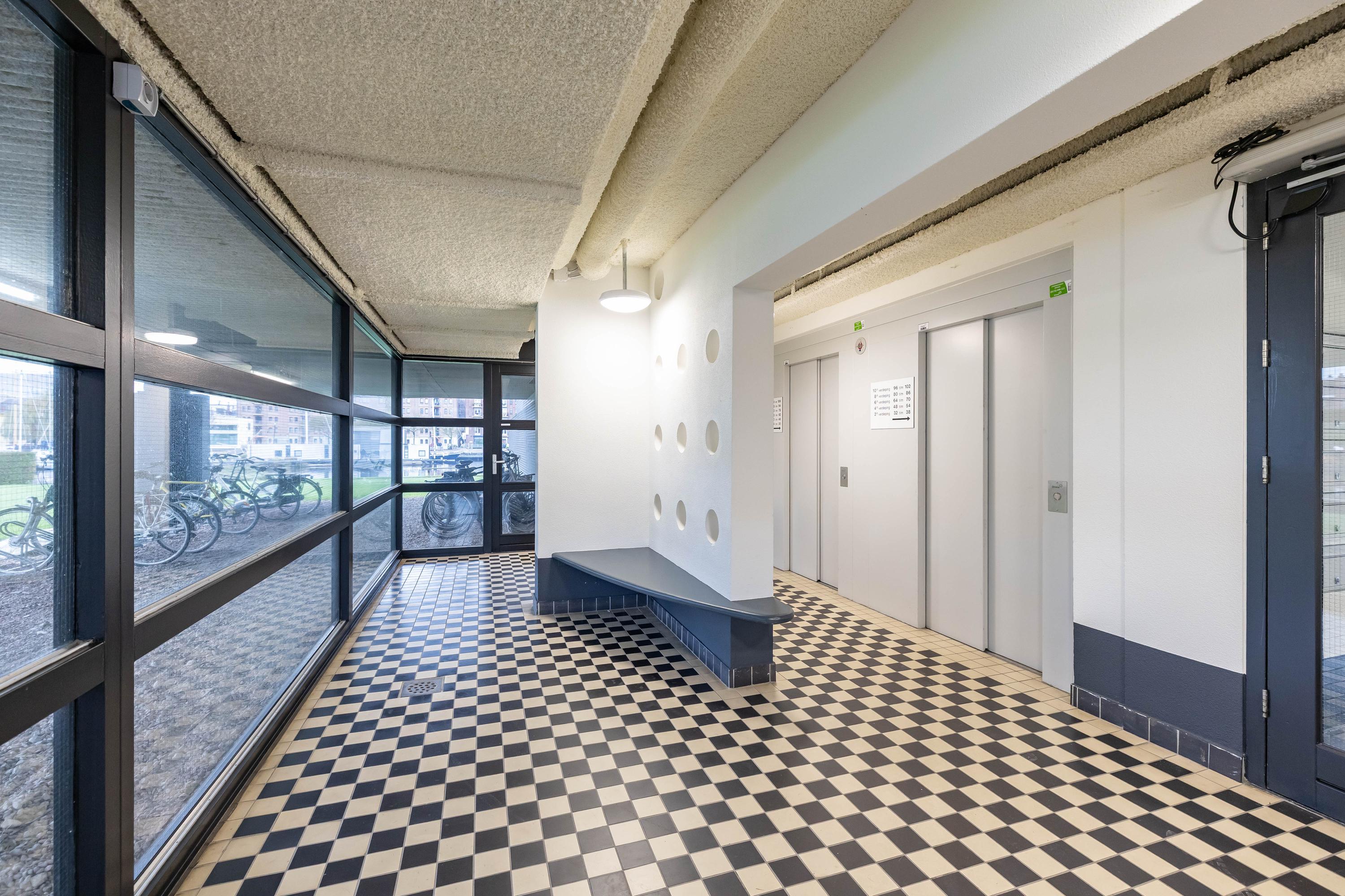 Indeling: entree, lift naar negende woonlaag, entree appartement, gang met toilet, badkamer, twee slaapkamers, woonkamer met open keuken, toegang tot balkon. Op de begane grond is een fietsenberging.