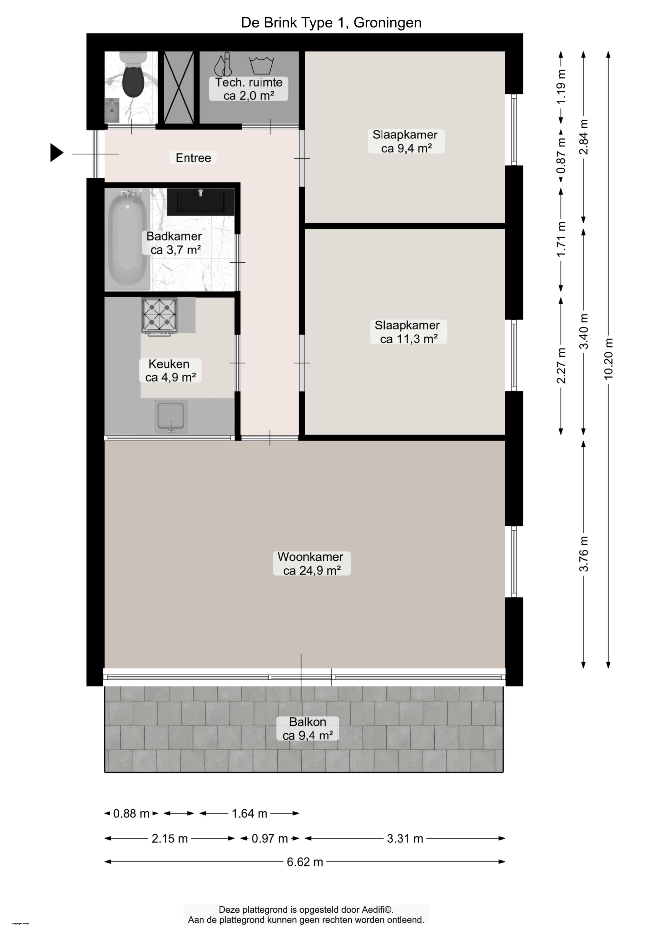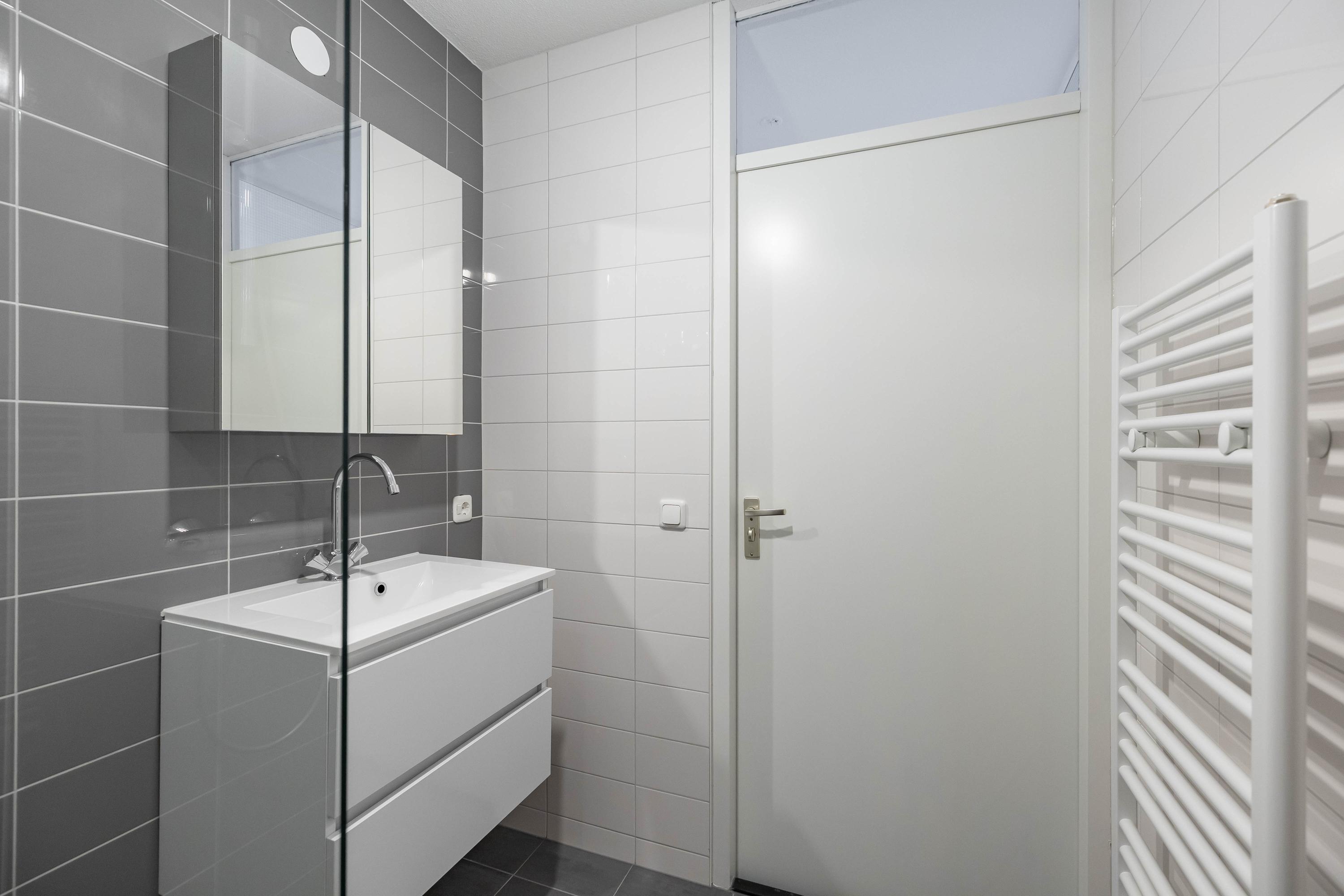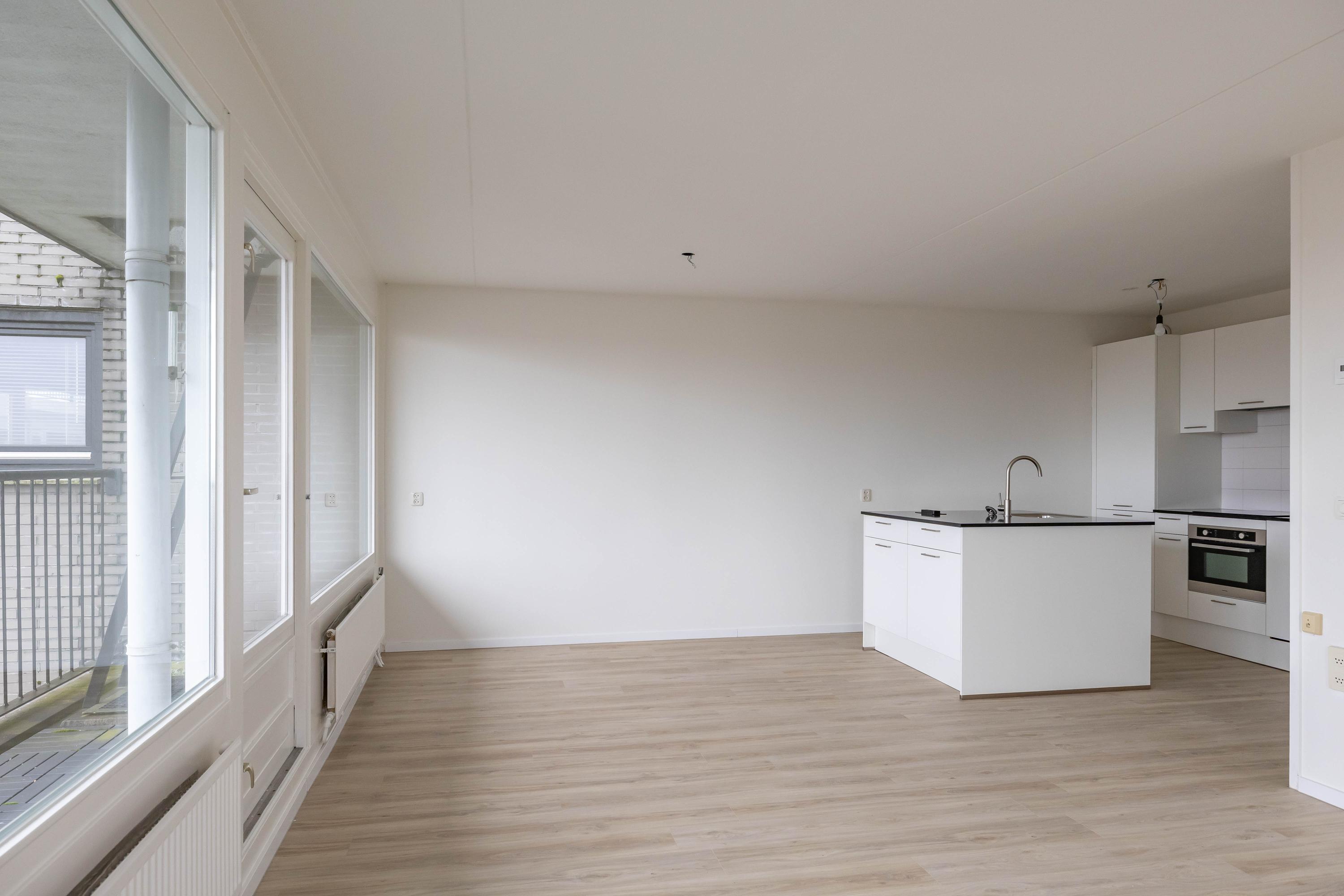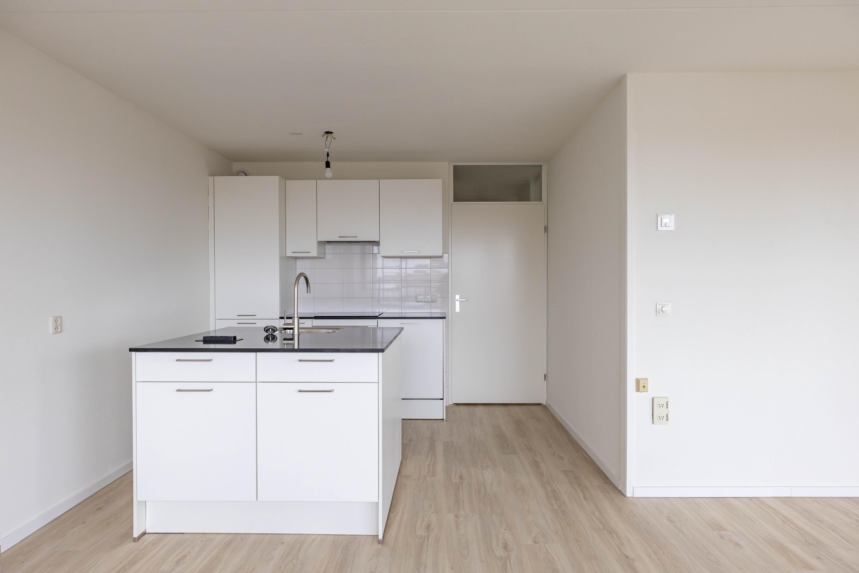 Indeling: entree, lift naar negende woonlaag, entree appartement, gang met toilet, badkamer, twee slaapkamers, woonkamer met open keuken, toegang tot balkon. Op de begane grond is een fietsenberging.