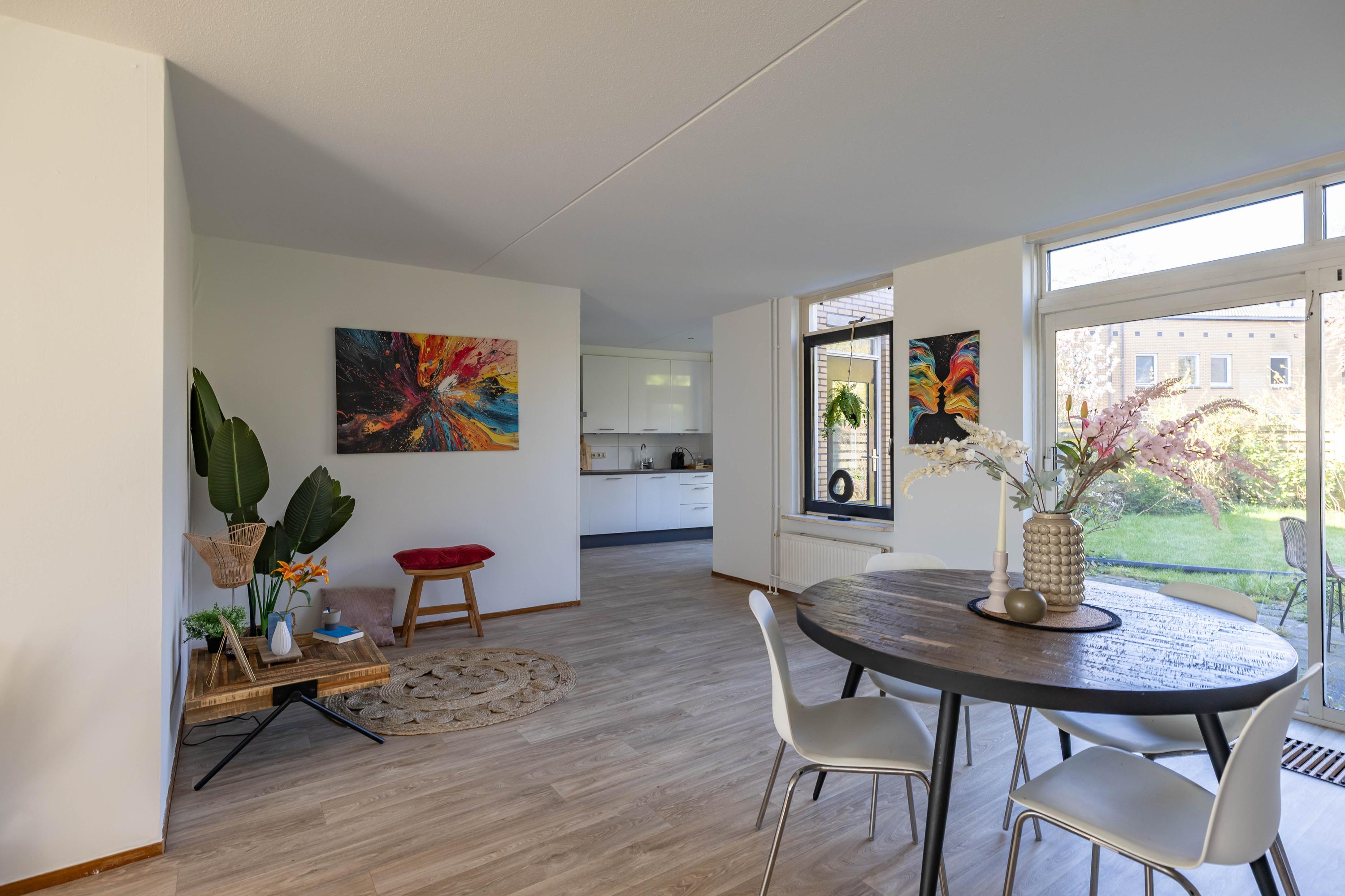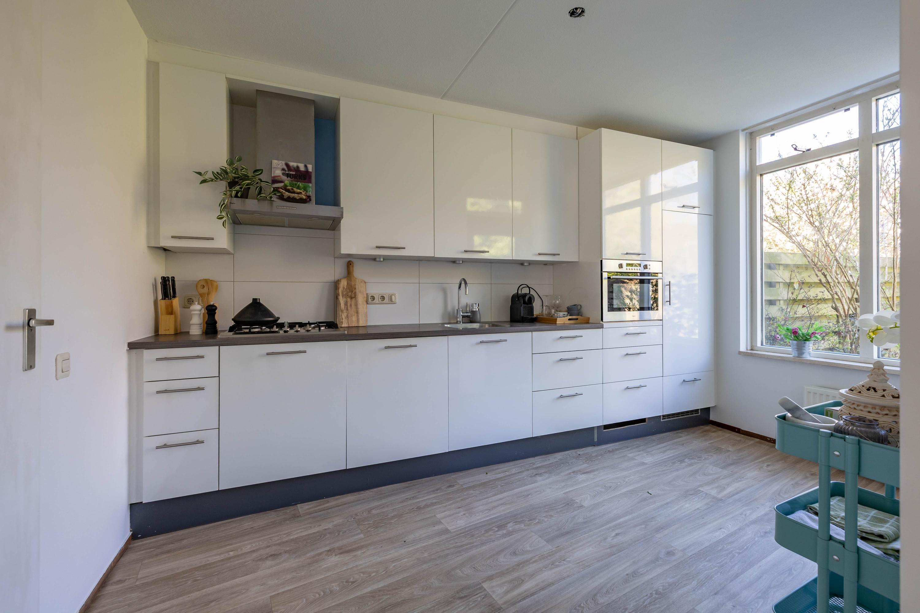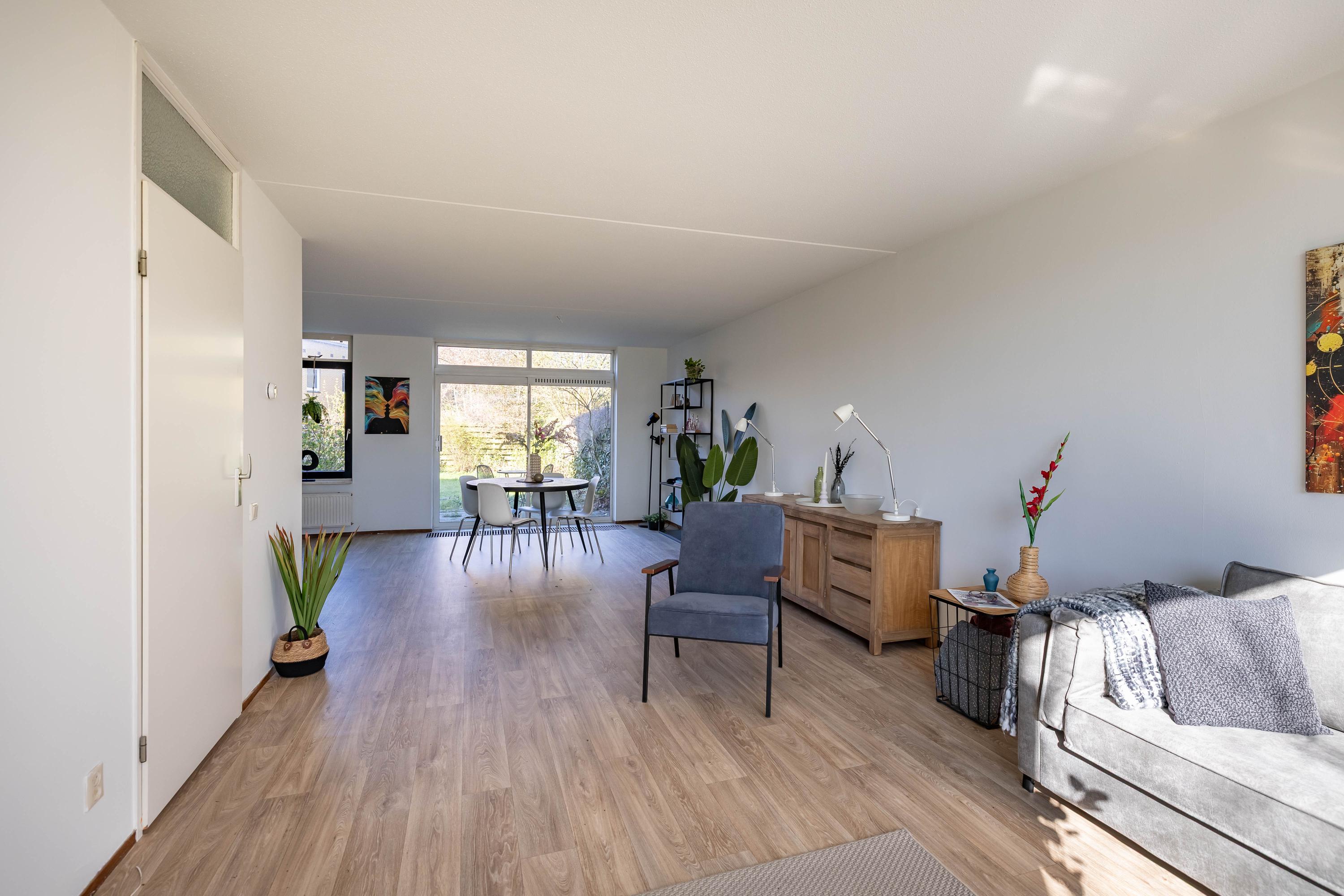 Deze royale eengezinswoning biedt comfortabele leefruimte, een praktische indeling en volop mogelijkheden voor het hele gezin. De lichte woonkamer staat in open verbinding met de halfopen keuken, waardoor een fijne, ruime leefruimte ontstaat. Dankzij de schuifpui heb je direct toegang tot de zonnige achtertuin, een heerlijke plek om te ontspannen, te spelen of uitgebreid te tafelen. De tuin is tevens bereikbaar via een achterom. Op de begane grond bevinden zich verder een inpandige garage en een nette entree/hal met toilet en trapopgang.