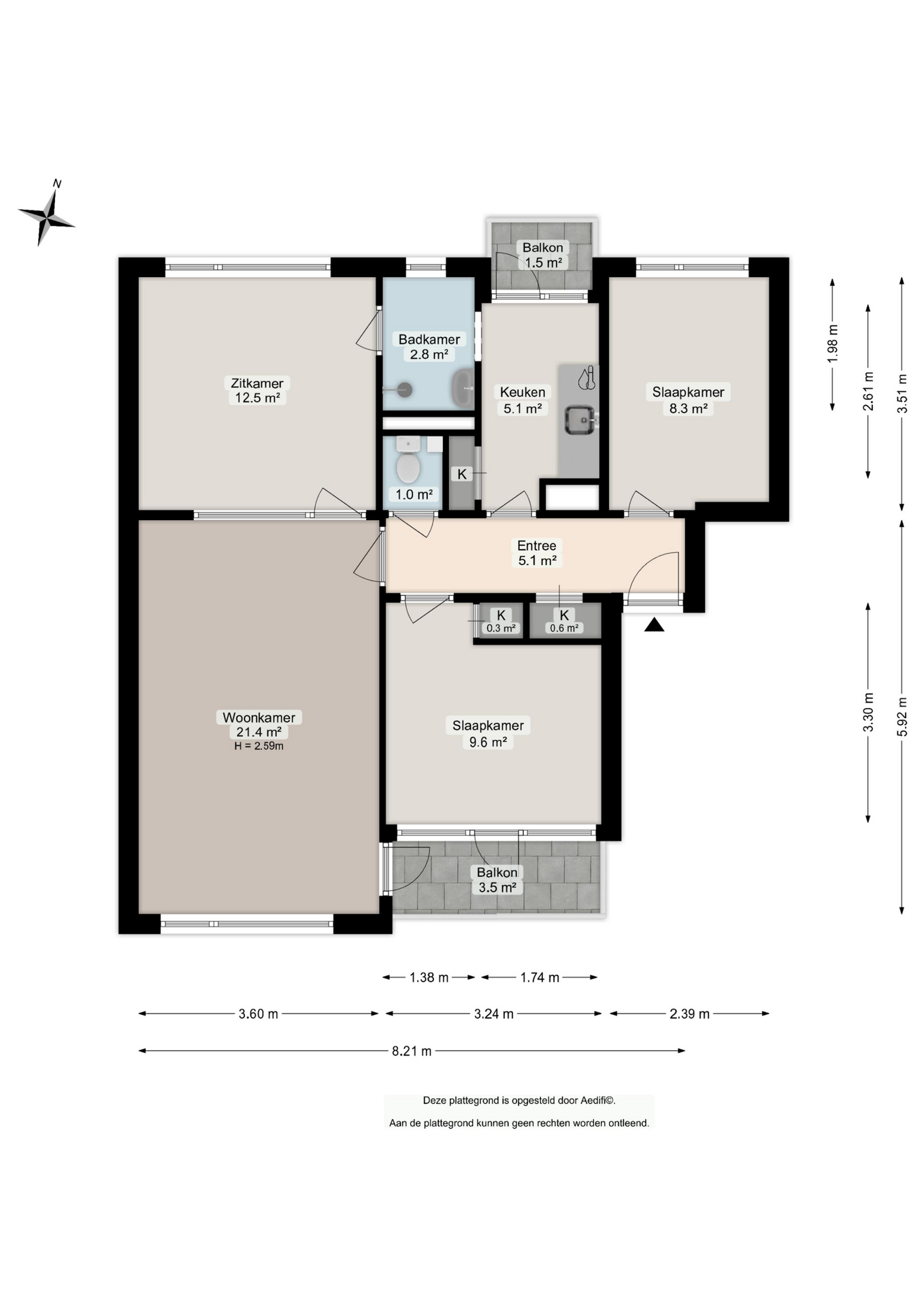 Bij binnenkomst betreedt u de hal, die toegang biedt tot twee slaapkamers, de keuken, het toilet en de woonkamer. De woonkamer geeft toegang tot de derde slaapkamer. Vanuit deze slaapkamer én vanuit de keuken is de badkamer bereikbaar, wat zorgt voor een praktische indeling.