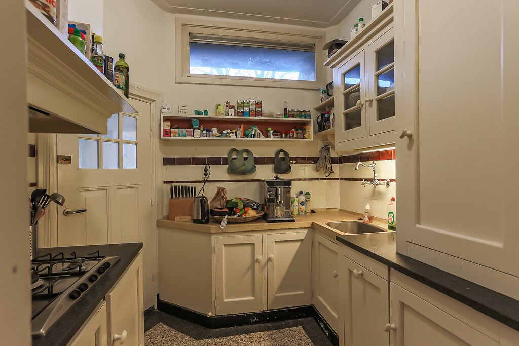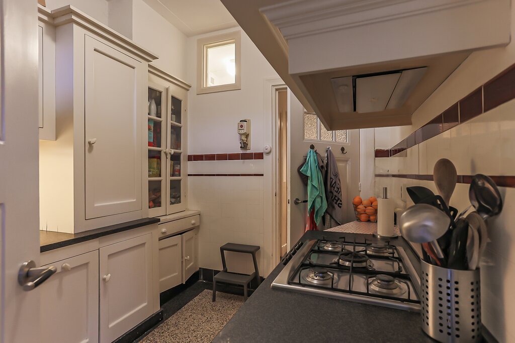 Indeling begane grond: entree, hal met originele granieten vloer, kelder, toilet met fonteintje, sfeervolle woonkamer (kamer en suite) met originele schouwen, eiken parketvloer en suitedeuren van (ca. 40m2) en in de achterkamer openslaande tuindeuren naar de patio, dichte keuken (6m2)met koelkast, vriezer, vaatwasser, 5 pits gaskookplaat en afzuigkap, gang, badkamer, berging/werkkamer (5m2), studeer-/kinderkamer (6m2), slaapkamer (13m2), logeerkamer (12m2). Het gehele huis is CV verwarmd en voorzien van dubbele beglazing.