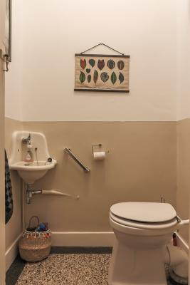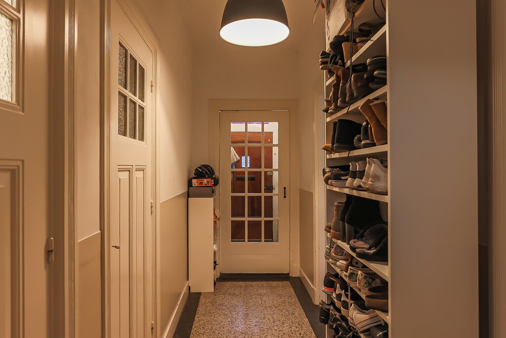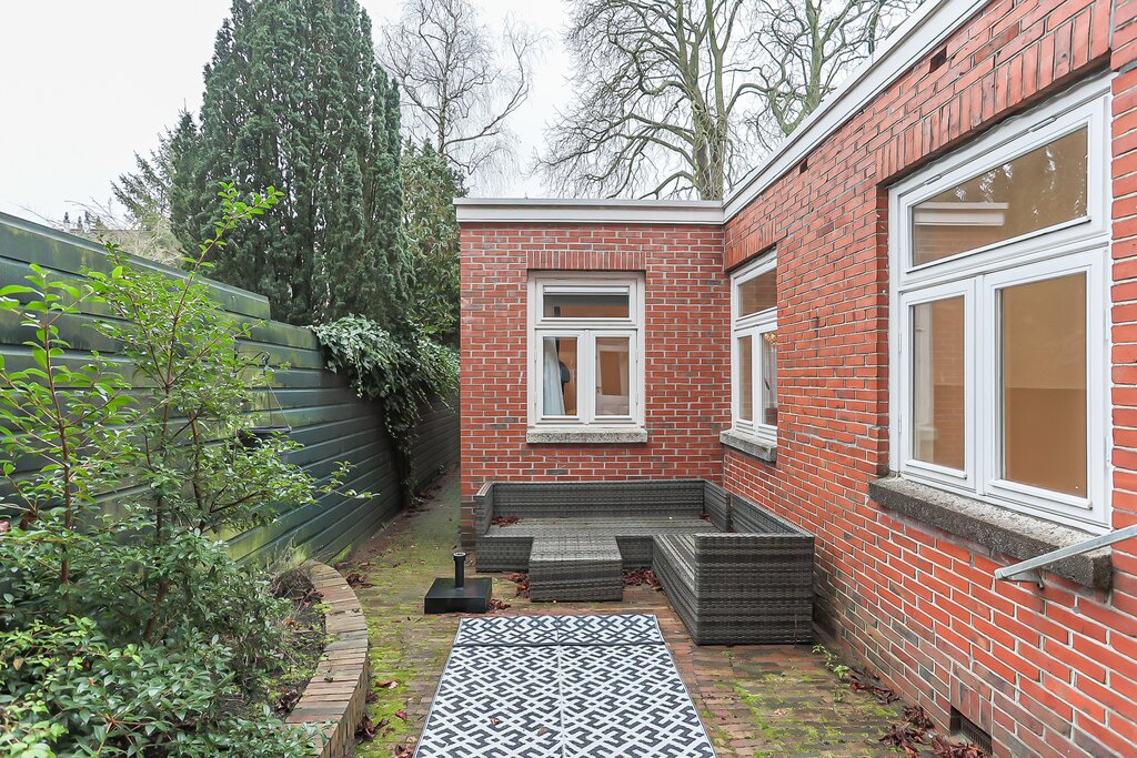Layout ground floor: entrance, hall with original granite floor, cellar, toilet with hand basin, attractive living room (room en suite) with original fireplaces, oak parquet floor and suite doors of (approx. 40 m2) and French doors to the patio in the back room, closed kitchen (6m2) with fridge, freezer, dishwasher, 5 burner gas hob and extractor hood, hallway, bathroom, storage room / study (5m2), study / children's room (6m2), bedroom (13m2), guest room (12m2). The entire house is central heating and double glazing.