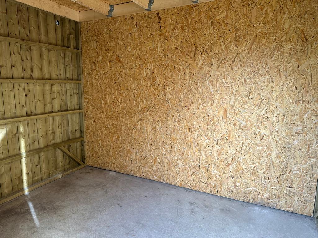 The garden features a detached wooden storage shed of approximately 6 m², fitted with electricity.
