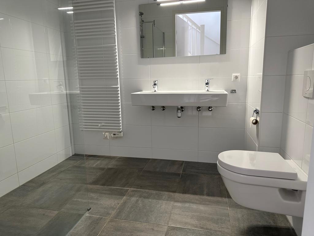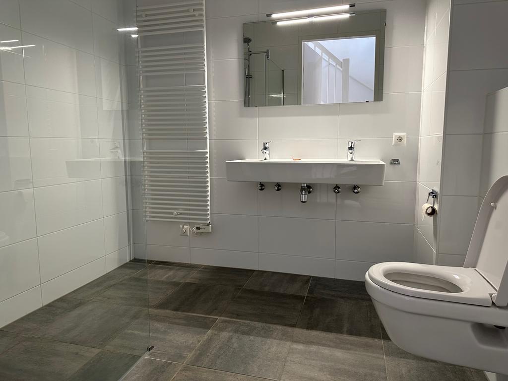 Overloop en twee slaapkamers van circa 12 m2 en 14 m2. Moderne badkamer voorzien van een tweede toilet, inloopdouche en dubbele wastafel.